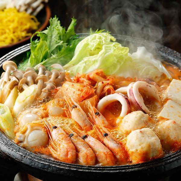 多彩な海鮮素材を本場韓国のピリ辛キムチを添えてお召し上がりください。季節を問わずにお楽しみいただける辛口の海鮮鍋です。ご自宅の野菜も一緒に煮込んでからお召し上がりください。