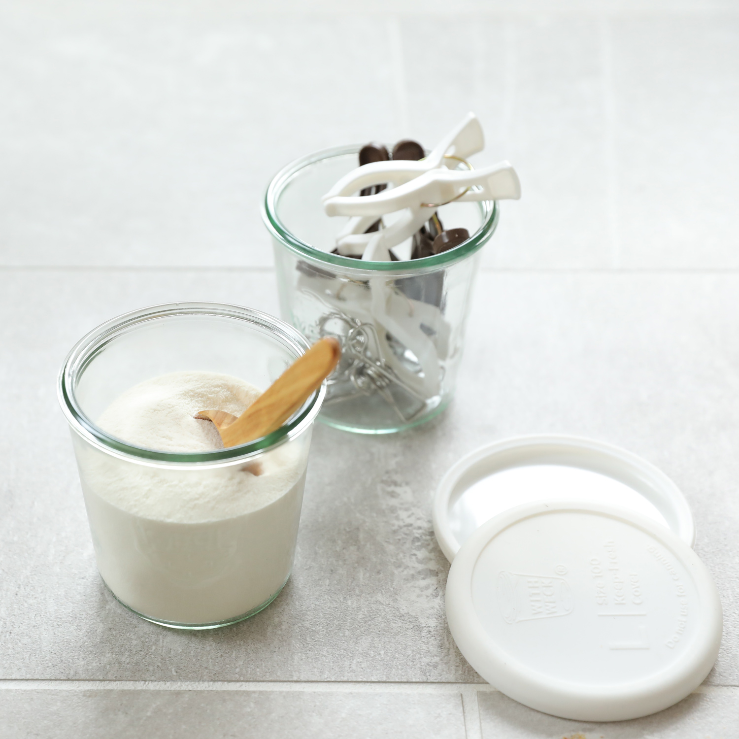 たっぷりの調味料ストッカーとして、おすすめのMOLD500mlとシリコーンキャップをセットに。調味料ストッカーとして塩・砂糖・粉類などを入れると、キッチンもすっきり。また、キッチンだけでなく、粉洗剤を入れたり洗濯ばさみを入れると、洗濯の時間もWECKと一緒。掃除用のブラシ類、ドライバーやペンチなどの工具などなど、道具を整理するツールポットとしても便利です。使い方の幅の広がるセットです。