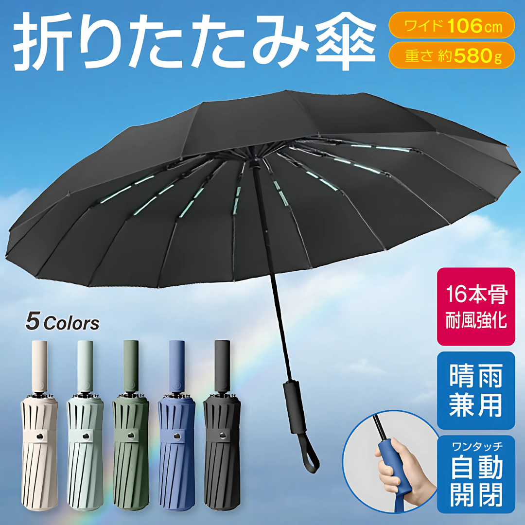 折りたたみ傘 メンズ 自動開閉 晴雨兼用 大きい 日傘 完全遮光 耐風強化 男性用 傘 16本骨 ワンタッチ 風に強い 丈夫 撥水 UVカット おしゃれ