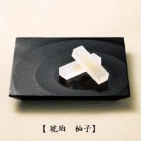 【琥珀 柚子】古の時代を閉じ込めた、気品溢れる宝石「琥珀」になぞらえて仕立てた寒天菓子です。柚子がほんのりと透けて見える、姿かたちの美しさにこだわりました。外側の歯ざわりと、内側のやわらかな寒天の妙味をお楽しみください。