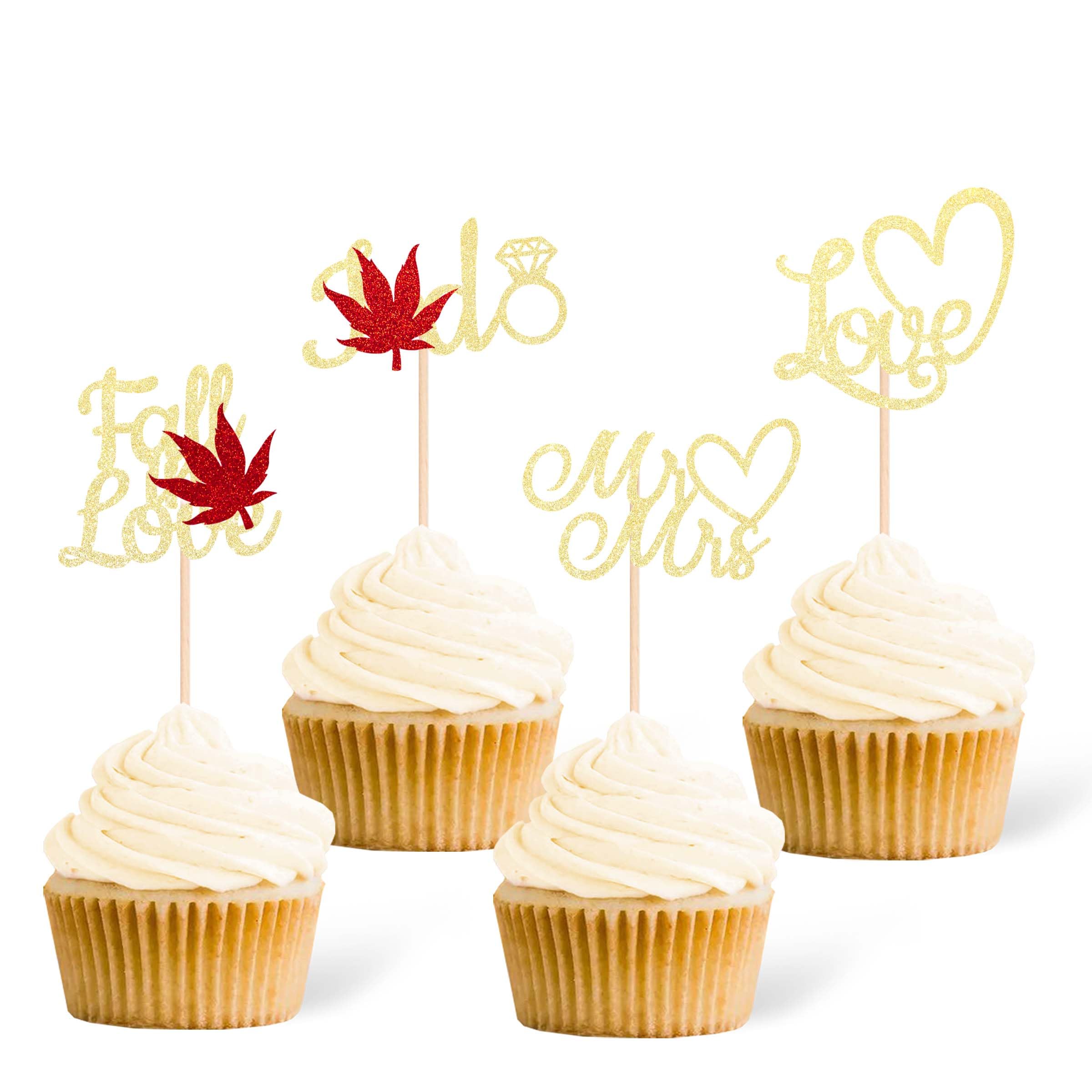 Gexolenu 24個 Fall in Love カップケーキトッパー グリッター レッドメープルリーフ ゴールド Love I Do カップケーキ