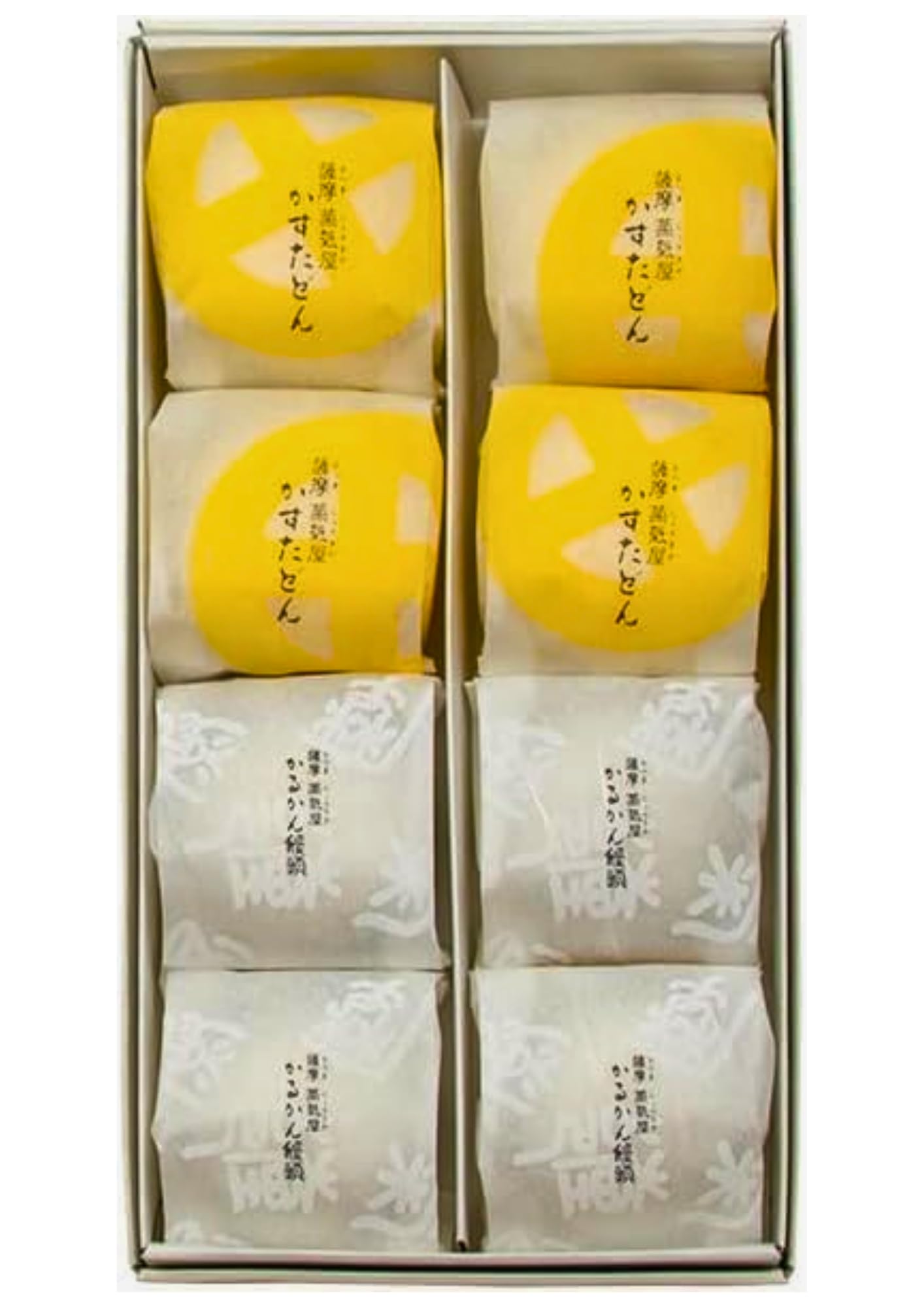 * 【かすたどん】鹿児島産の卵をたっぷり使ったカスタードクリームをふんわりスポンジで包み込み可愛く仕上げたトロリとしたカスタードクリームのソフトな風味が特徴の蒸し菓子です。 * 【かるかん饅頭】山芋をふんだんに使用した伝統の味と匠の技、薩摩蒸気屋のかるかん饅頭です。かるかんに国内産の小豆あんが入ったおまんじゅうです。