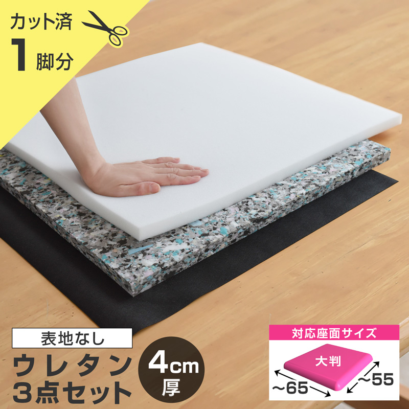 ウレタン3点セット(表生地なし)![]() クッション材と、裏張り用不織布の3点セット。 合計厚みは4cm(ウレタン2cm厚)、5cm(ウレタン3cm厚)の2種類をご用意しています。 ![]() ![]() ![]() ![]() ![]() ![]() |