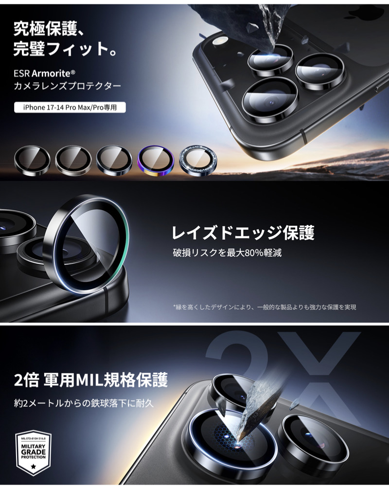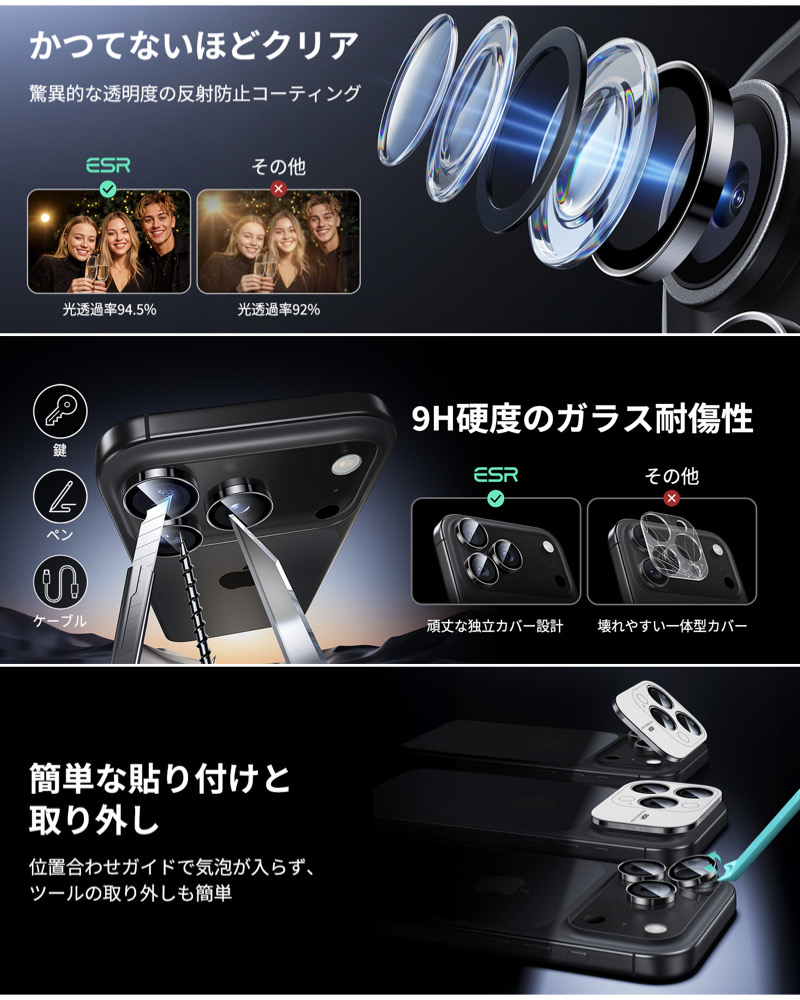 | ESR iPhone カメラフィルム | 【究極のレンズ保護】 50kgの耐力をもつ高質な超強化ガラスは、衝撃や傷、ひび割れからレンズを確実に保護します。 【クリスタルクリアな写真】 独立型レンズ設計によりフラッシュが覆われず、機能性がキープされるため、超高透過により、写真のオリジナル画質を維持します。 【簡単取り付け】 取り付けガイドとクリーニングキットにより、気泡なく簡単に貼り付けられ、取り外しツールで簡単に取り外すことも可能です。 【パッケージ内容】独立型レンズフィルム、クリーニングキット、取り付けガイド、マニュアル。 |