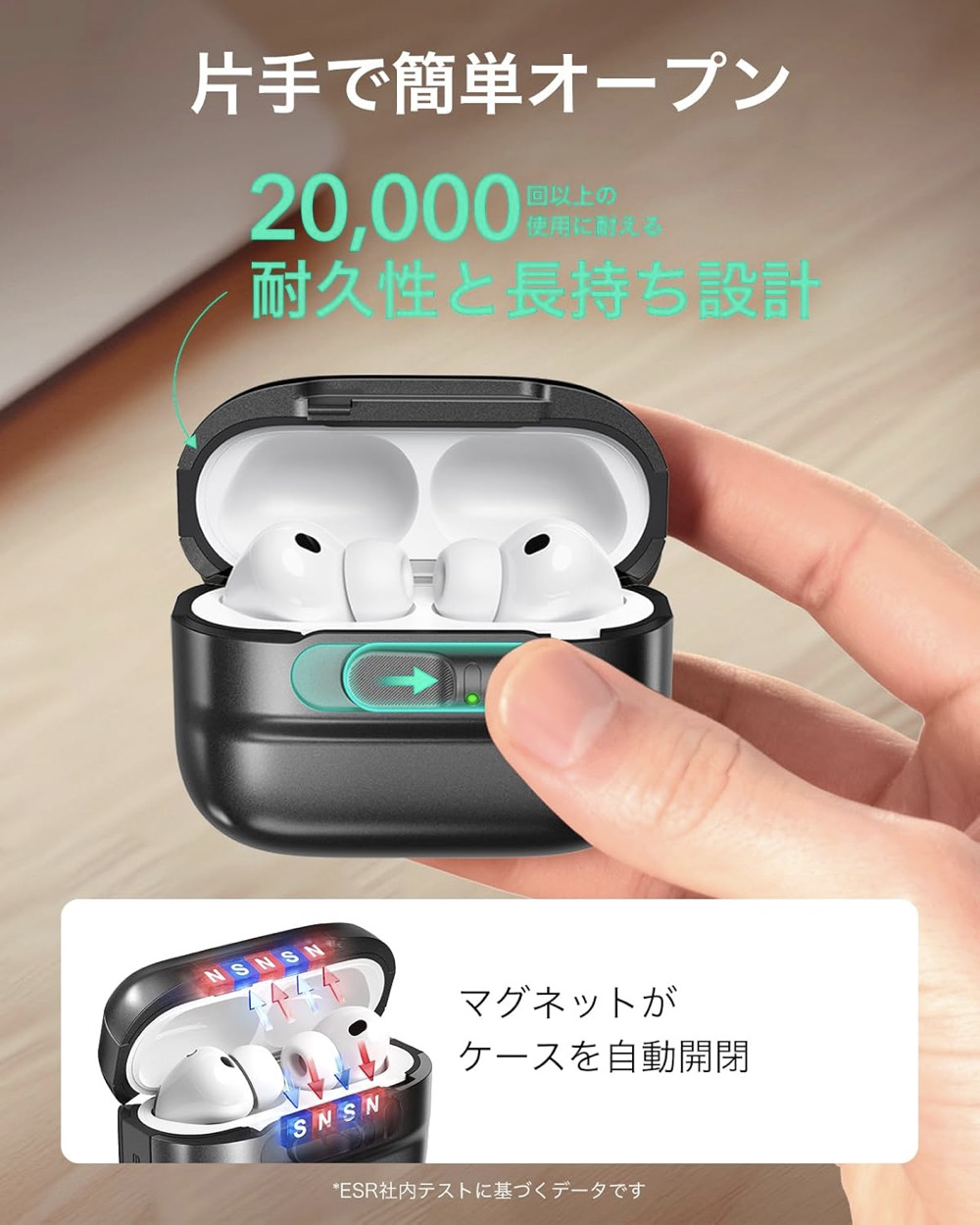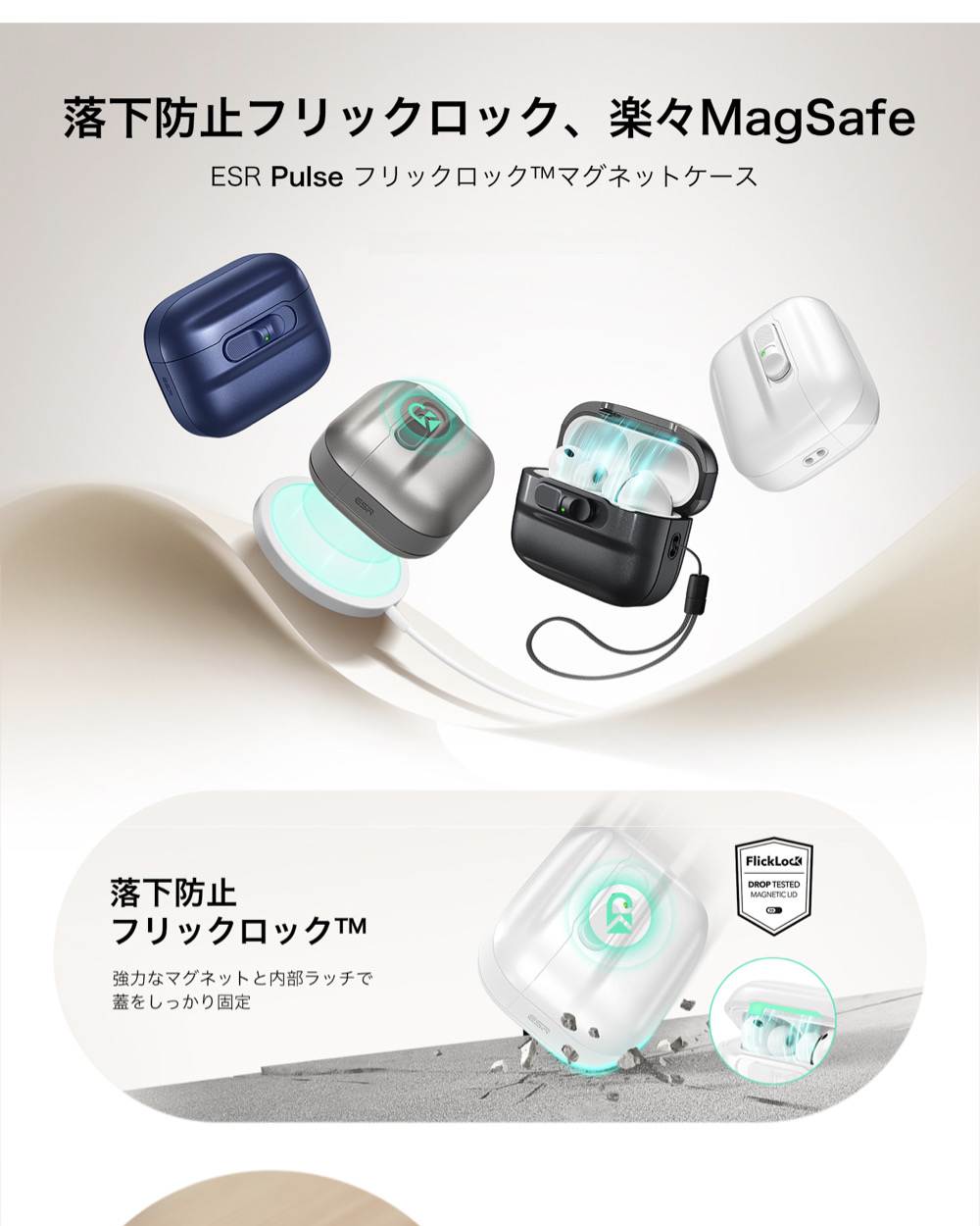 | ESR AirPds Pro ケース | 【互換性】 AirPods Pro 第2/1世代 (2023/2022)と、AirPods第4世代(2024)(USB-C)。イヤホンと充電ケースは含まれません。 【落下防止リッドロック】 リッドの上部と底部にある700gの保持力を持つ強力なマグネットと内部のラッチにより、AirPodsを内部にしっかりロックし、落としてもイヤホンが飛び出すことはありません。 【スライドして開く】 前面のゴム製スライダーをスワイプするとラッチが開き、磁石の極性が反転し、蓋がスプリング状に開き、片手でイヤホンにすぐにアクセスできます。 【MagSafe対応】 ケース背面の強力なマグネットがMagSafe充電器を確実にロックし、ワンタッチでワイヤレス充電を楽しめます。 【ハイブリッド落下保護】 超硬質シェルと柔軟な衝撃吸収コアで充電ケースを2重に保護し、AirPodsをしっかりと保護し、新品のように保ちます。 |