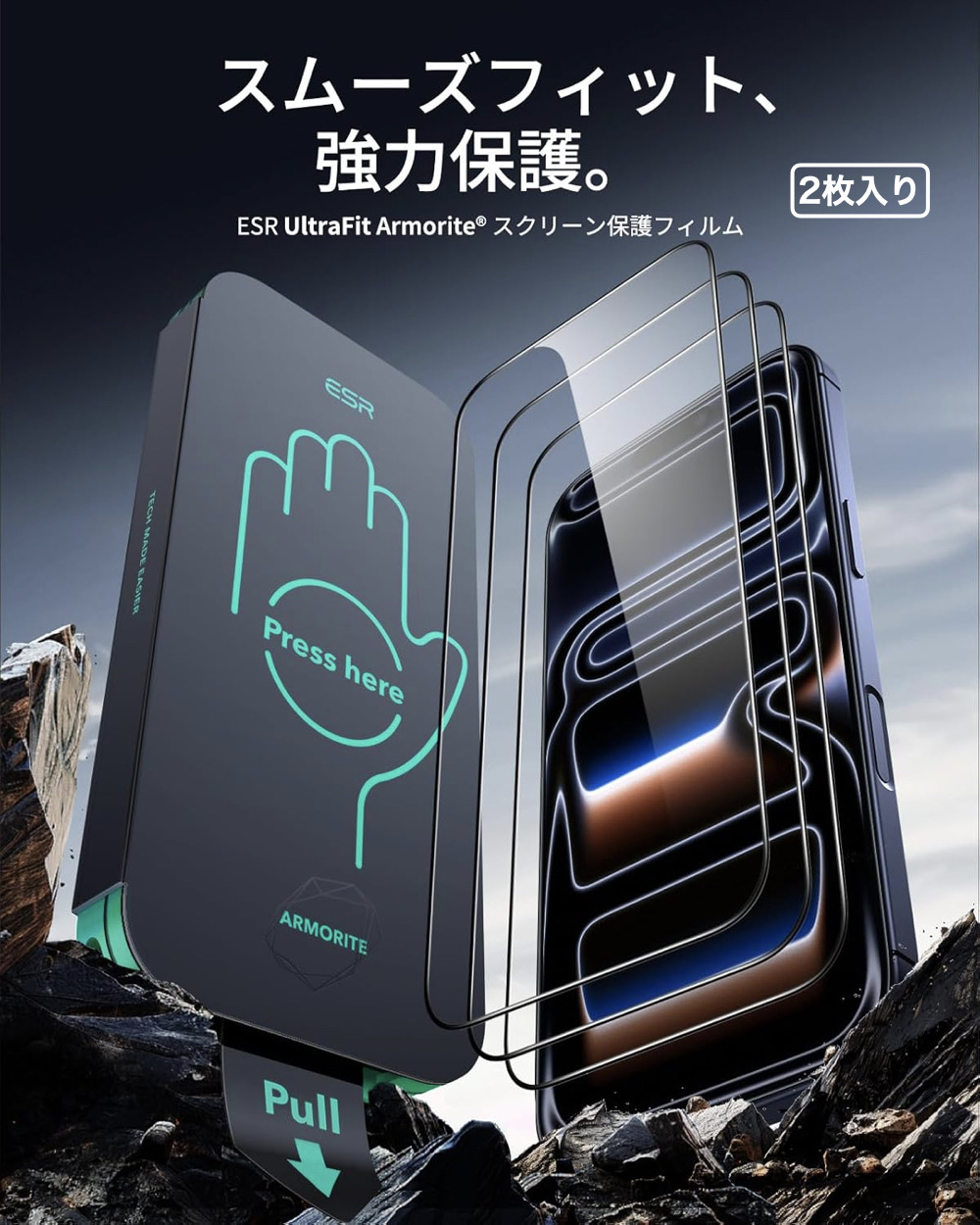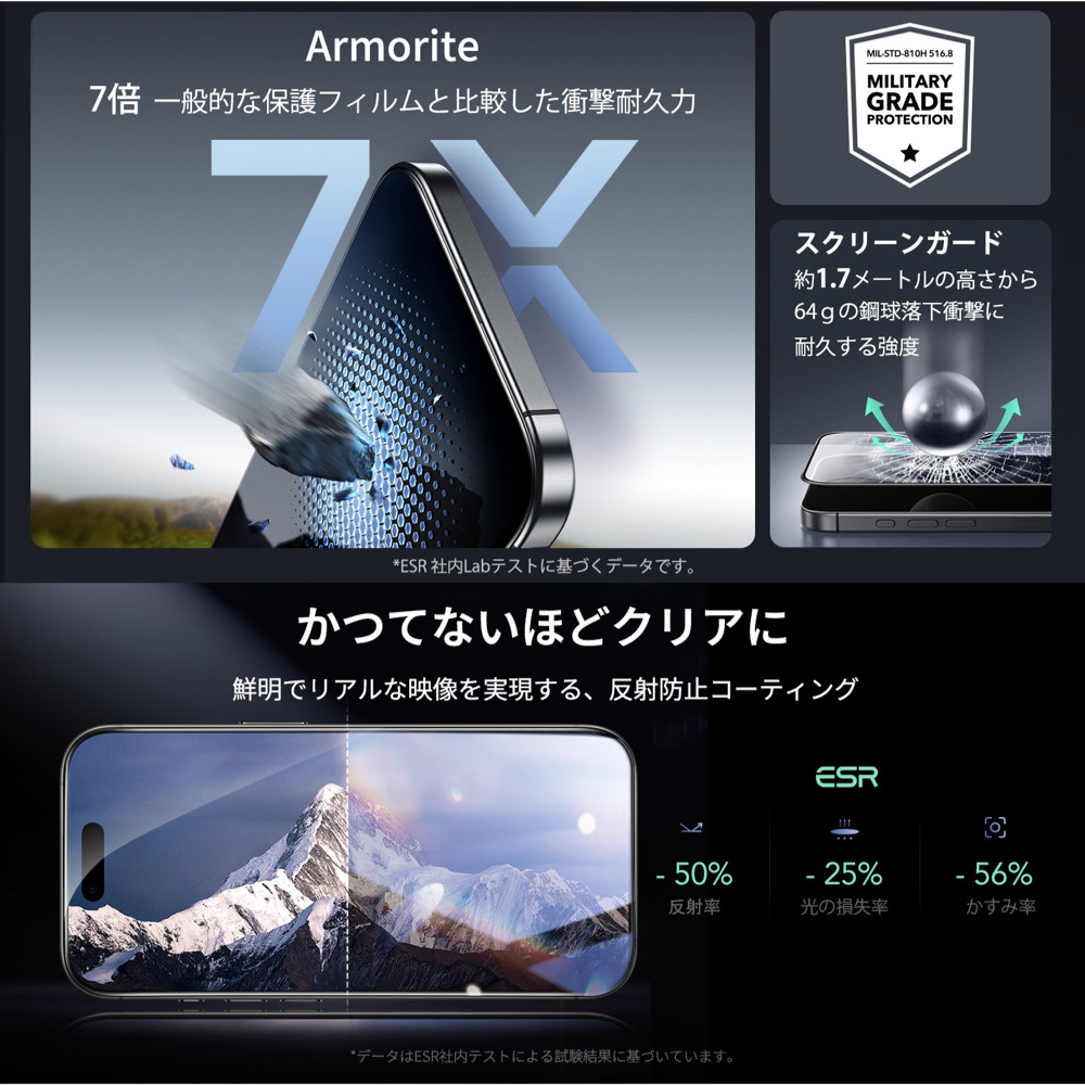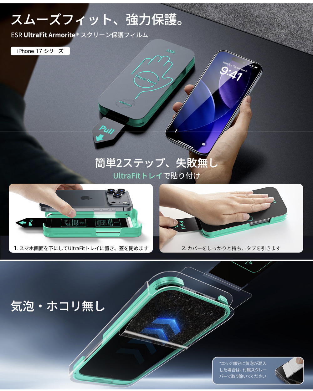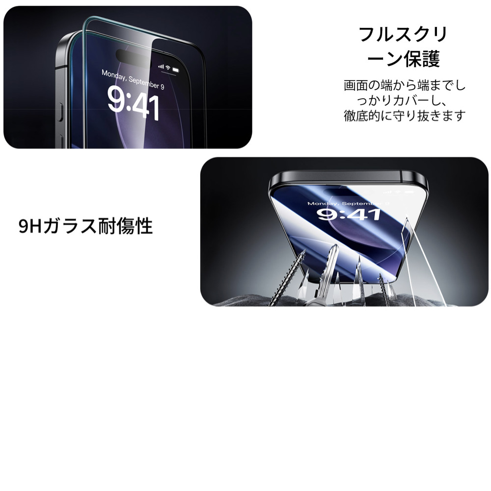 | 保護フィルム | 【2枚入り】 こちらの商品は、2枚入りの商品です。 【素早く正確な装着が可能なUltraFit】 ESR iPhone スクリーン保護フィルム用のクリーニングキットと、2ステップで貼り付けが行える専用貼り付けツール【UltraFitトレイ】が付属(使用前に説明書を必ずご確認ください)しています。誰でも気泡ゼロで簡単に装着できます。 【超強力保護】 ESR ガラスフィルムの超耐久強化ガラスは最大約50kgの圧力に耐え、落下や衝撃、キズから画面をしっかり保護します【気泡・埃ゼロの完璧な密着】ESR ガラスフィルムの先進のナノ接着技術により、気泡や埃が入らず、クリスタルクリアな画面の美しさを保ちます。 【同梱品】ESR Armoriteスクリーン保護フィルム3枚(iPhone Air専用)、UltraFitトレイ、クリーニングキット、取扱説明書が同梱されています。 |