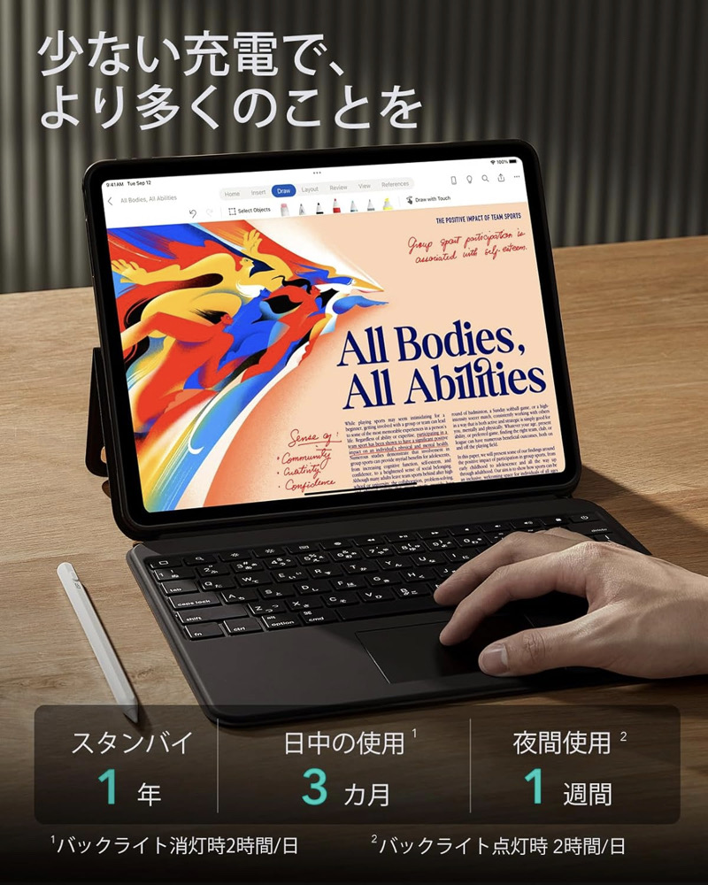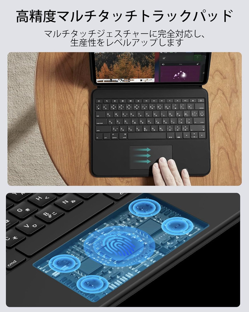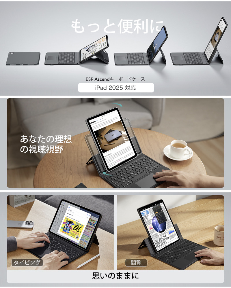 | ESR iPad キーボードケース | 【対応機種】・iPad Air 13インチ (M4,2026)(M3,2025)(M2,2024)(2025/2024年モデル)→選択肢:iPad Air 13インチ (M4,2026)(M3,2025)(M2,2024) ・iPad Pro 13インチ(M5/M4)(2024年モデル)(モデル番号:A2925/A2926/A3007)→選択肢:iPad Pro 13インチ(M5/M4) ・iPad Pro 11インチ(M5/M4)(2024年モデル)→選択肢:iPad Pro 11インチ(M5/M4) ・iPad 第11世代 (A16) / iPad 第10世代→選択肢:iPad 無印(第11/10世代) 【どこでもワーク】 MacBookの機能をそのままケースに内蔵し、リモートワークの革命を体験できます。 【自由自在に角度調節可能なスタンド】 15°〜180°の角度調節が可能なスタンドで、どんな作業にも最適な角度を見つけられます。【自由自在に角度調節可能なスタンド】15°〜180°の角度調節が可能なスタンドで、どんな作業にも最適な角度を見つけられます。 【縦向きと横向きの表示】 iPadを縦向きと横向きに簡単に切り替えられるので、ラップトップではできなかったような書類の編集や閲覧が可能です。 【自在に変身する保護】 キーボードの有無にかかわらずiPadを保護するマグネット式バックケースで、仕事場からモバイルタブレットへと素早く変身。 |