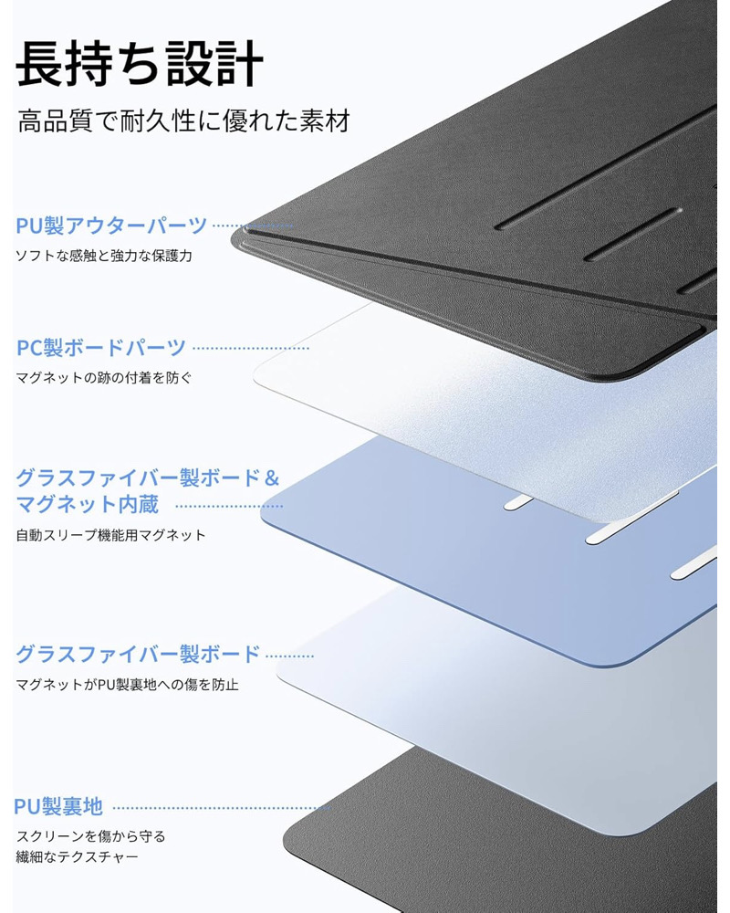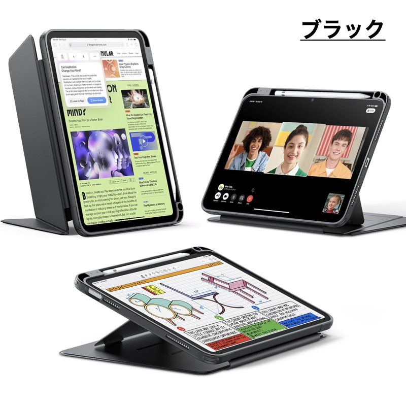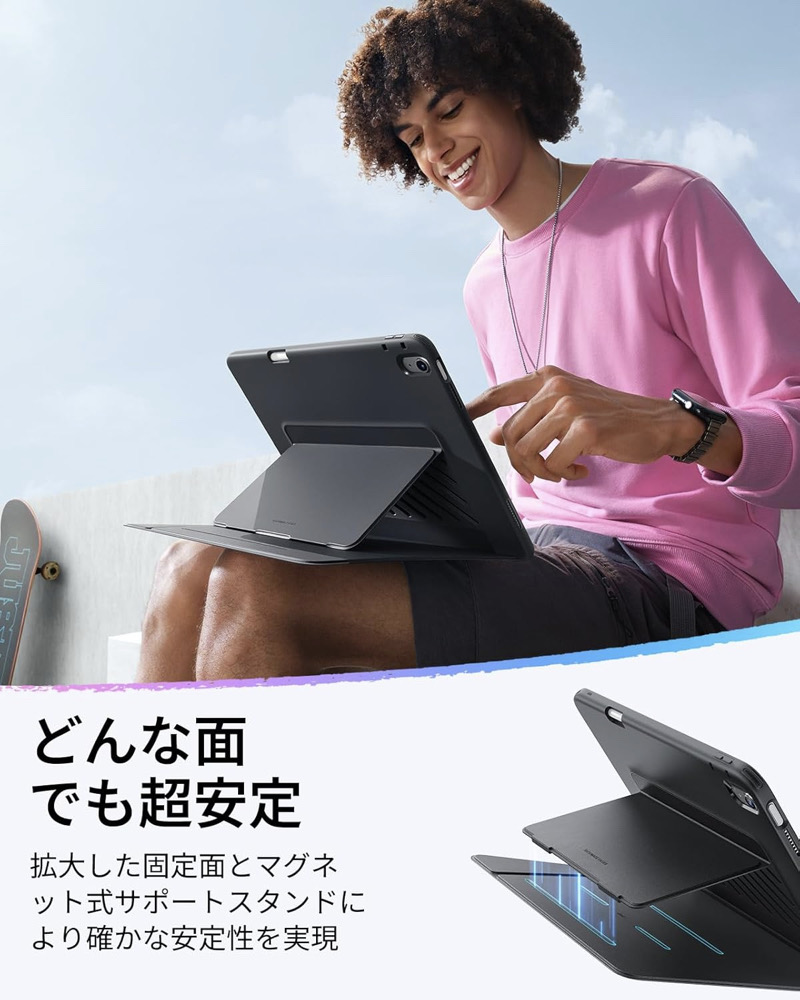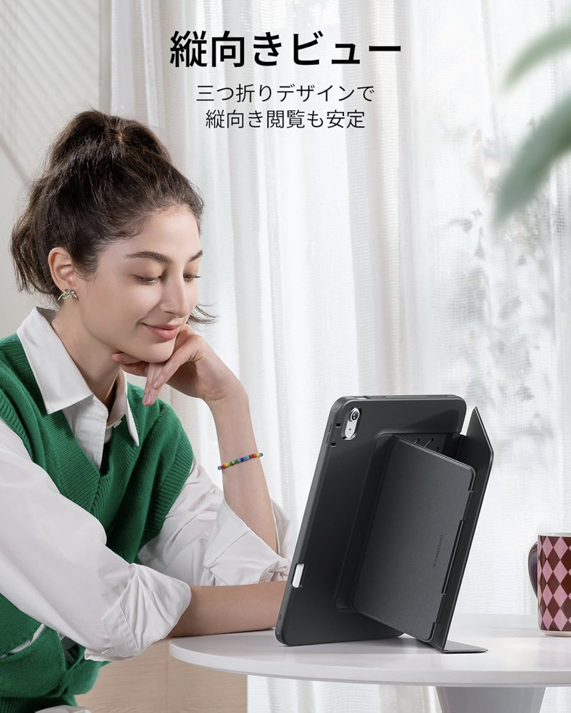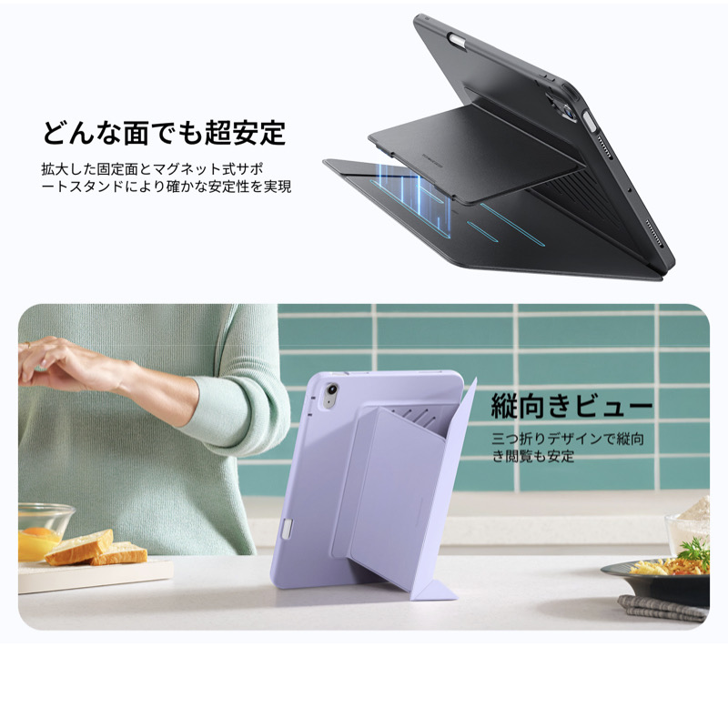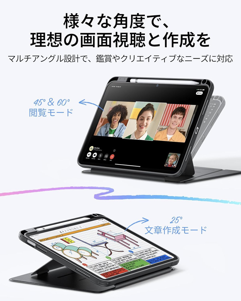 | iPad ケース | 【簡単縦向きブラウジング】 独創的な折りたたみと三角形の構造設計により、縦向きでの閲覧が楽になり、ソーシャルメディア、ショートビデオの視聴、読書、ニュースのチェック、ゲーム、描画、文章作成などにタブレットケースで効率よく作業が行えます。 【マルチアングルデザイン】 2つのスタンドモードに対応しており、45°〜60°はビデオ鑑賞、作業、FaceTimingなどに最適なビューイングモードへと、25°に調節した場合は執筆、絵画、その他のクリエイティブな作業に最適なライティングモードへと用途に合わせて角度調節が行えます。 【超安定スタンド】 幅広いカバーと強力なマグネットブラケットで設計された当ケースは、ソファ、ベッド、手、膝の上など、どのような表面でも安定し、滑ることなく安定性を保ちます。 【持ち運び簡単・軽量】 スリムで軽量なので、旅行、仕事、通勤時に簡単に持ち運べます。 |