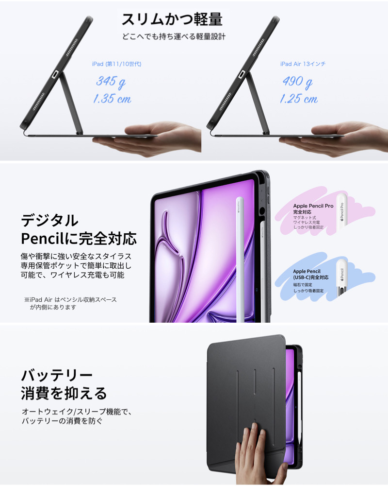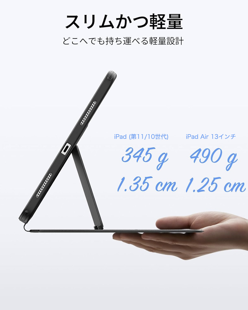 | 対応機種 | ・iPad 第11世代 A16 (2025) ・iPad 第10世代 (2022) ・iPad Air 11インチ (M3/M2) ・iPad Air 13インチ (M3/M2) ・iPad Pro 11インチ(M5/M4) ・iPad Pro 13インチ(M5/M4) |