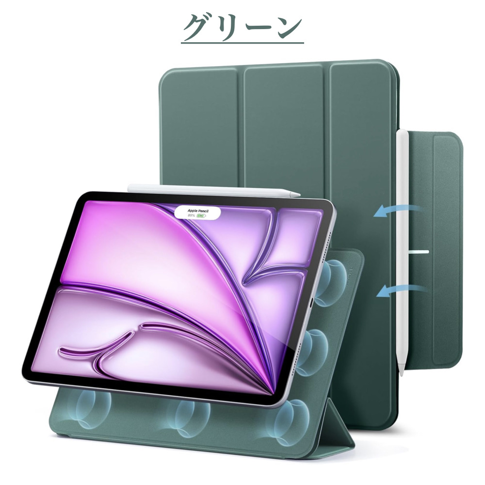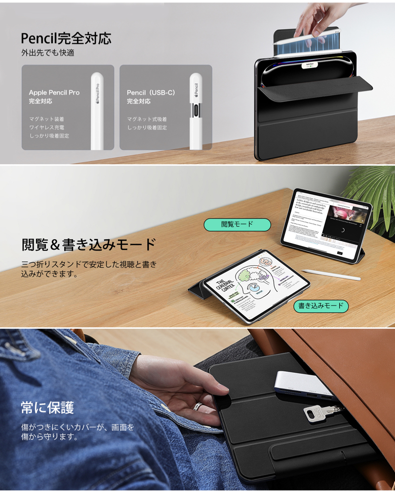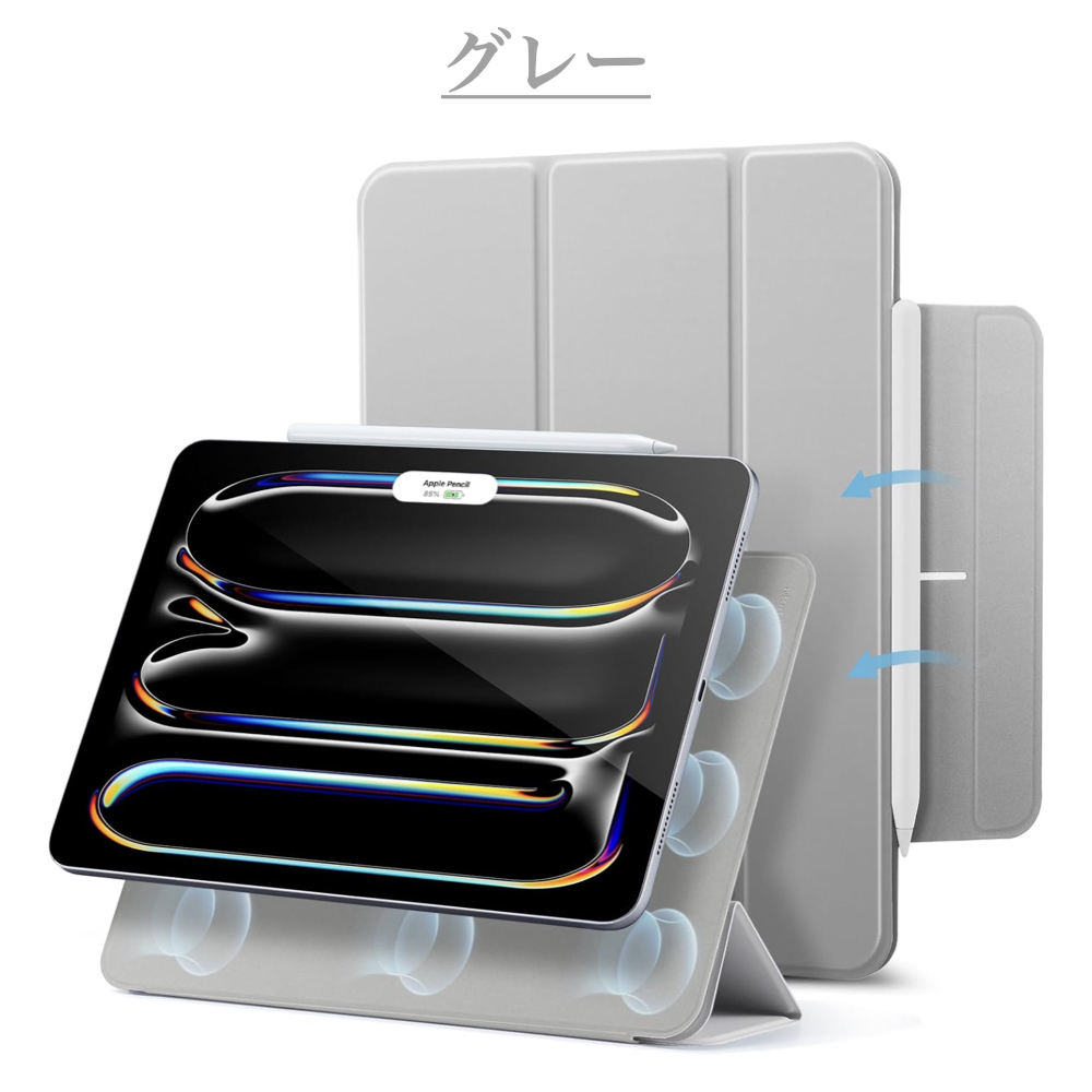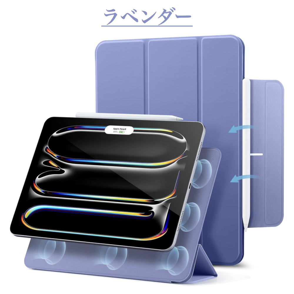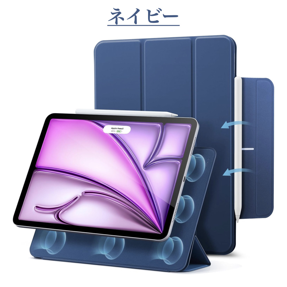 | iPad ケース | 【マグネット吸着】 内蔵された多数のマグネットが、カバーとiPadをしっかり密着させ安定感抜群です。 【Apple Pencil 2 対応】 オープンサイドデザイン(iPad側面が覆われていない)により、Apple PencilのiPadへのペアリングとワイヤレス充電機能に対応しています。 【視聴&タイピング 2段階スタンド】 三つ折りフロントカバーにより、映画の視聴とキーボード入力に合わせた2通りのスタンド角度を調整できます。 【反応抜群 オートスリープ/ウェイクアップ】 強力なマグネットにより、オートスリープ/ウェイクアップ機能がしっかり素早く動作します。 |