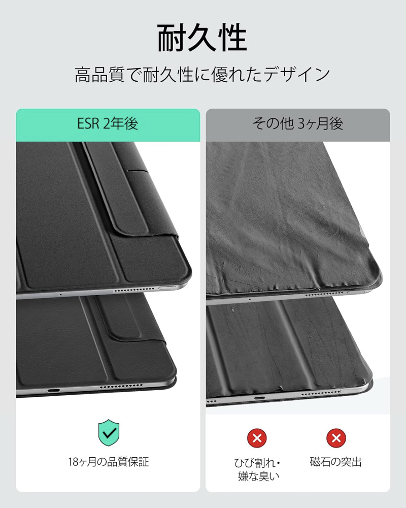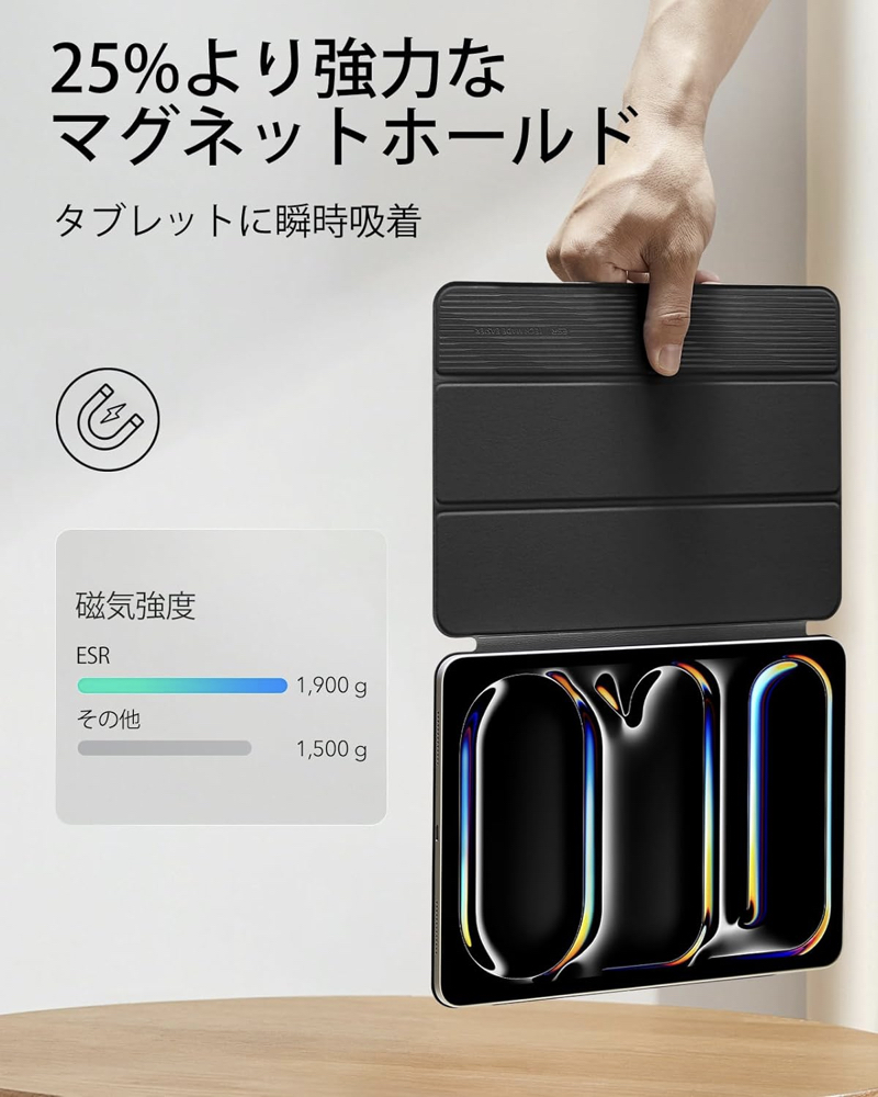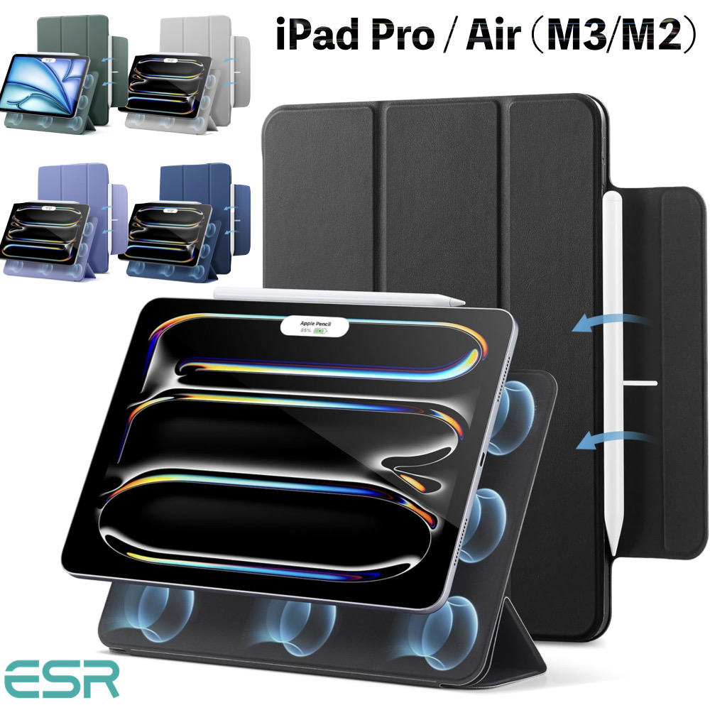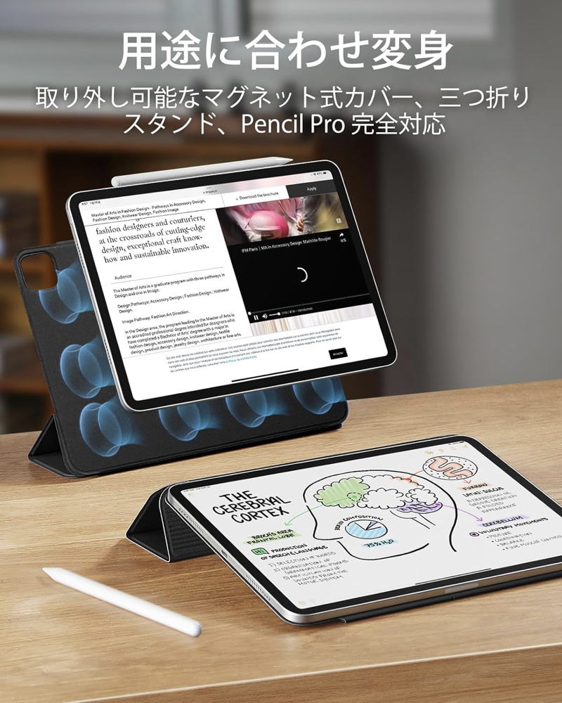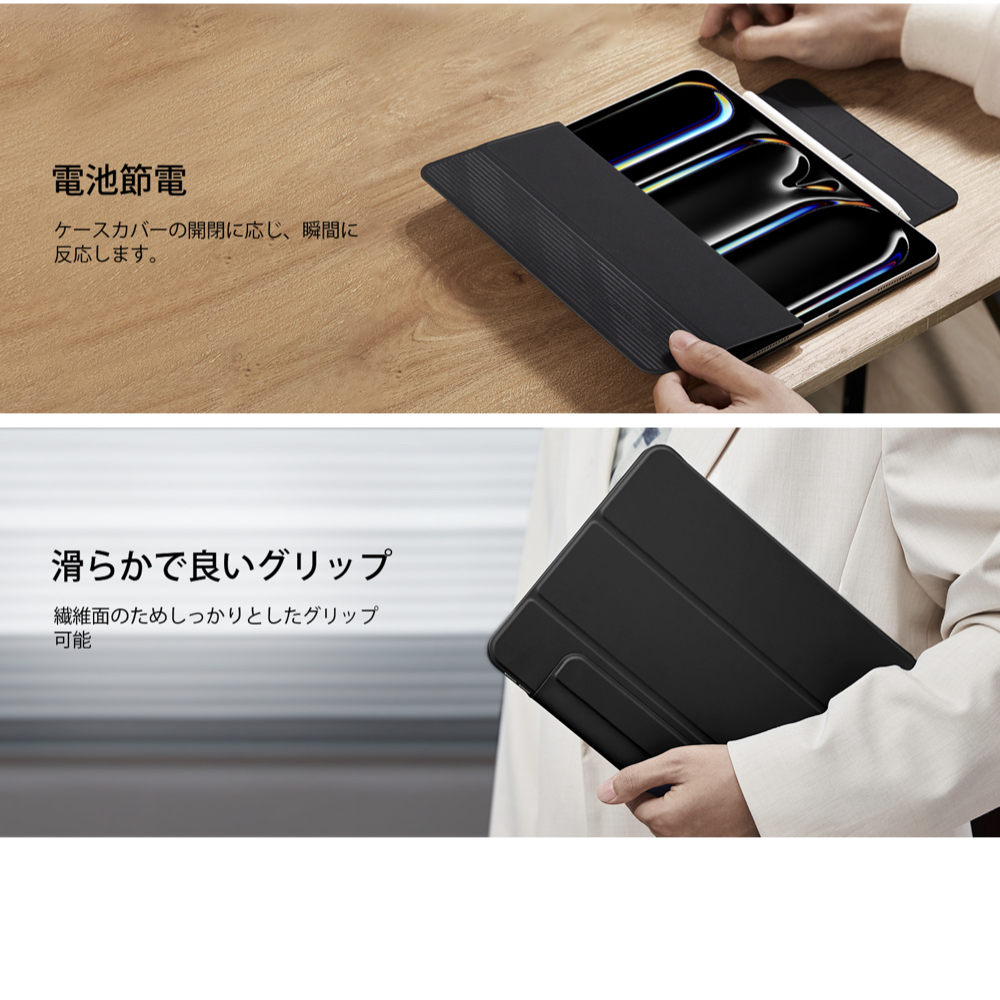 | iPad ケース | 【マグネット吸着】 内蔵された多数のマグネットが、カバーとiPadをしっかり密着させ安定感抜群です。 【Apple Pencil 2 対応】 オープンサイドデザイン(iPad側面が覆われていない)により、Apple PencilのiPadへのペアリングとワイヤレス充電機能に対応しています。 【視聴&タイピング 2段階スタンド】 三つ折りフロントカバーにより、映画の視聴とキーボード入力に合わせた2通りのスタンド角度を調整できます。 【反応抜群 オートスリープ/ウェイクアップ】 強力なマグネットにより、オートスリープ/ウェイクアップ機能がしっかり素早く動作します。 |