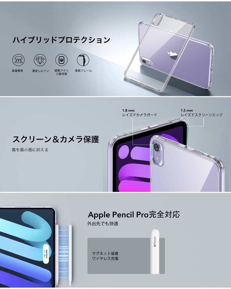 | iPad ケース | 【透明度抜群】 傷に強いポリカーボネイト背面は、iPadを傷から保護でき、黄変しないので、長期間にわたりiPadオリジナルの美しさを保つことができます。 【スリムで軽量】 スタイリッシュなデザインと高品質素材により、このClassic HybridケースはiPad miniの軽量さや薄さを損なうことなく、ダメージからiPadを保護することができます。 【ハイブリッド保護】 柔軟なポリマーフレームと硬いポリカーボネイト背面、衝撃吸収エアガードコーナー、スクリーン・カメラ周辺の縁を高くした設計を組み合わせることで、iPadを落下や傷から包括的に保護することができます。 【Apple Pencil 2対応】 側面を精確にカット加工し、Apple Pencil 2のために十分なスペースを確保しているので、ケースをつけた状態で、磁気を利用してiPadに引っ付けてペアリング・充電することができます。 ・各ボタンまでカバー、精確なスピーカー穴カットアウト、隅々までカバーする保護力 大事なiPadだからこそこだわりが詰まったESRケースを選んでみてはいかがでしょうか。 |