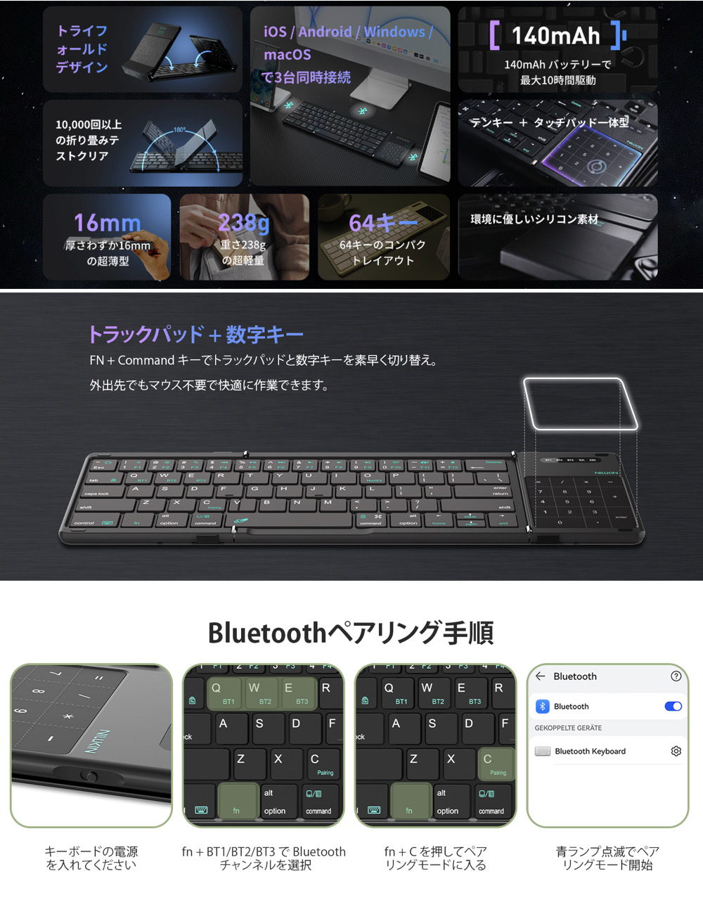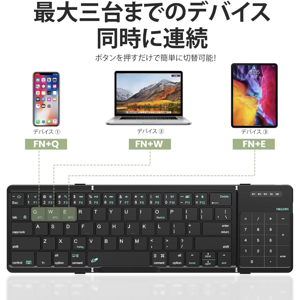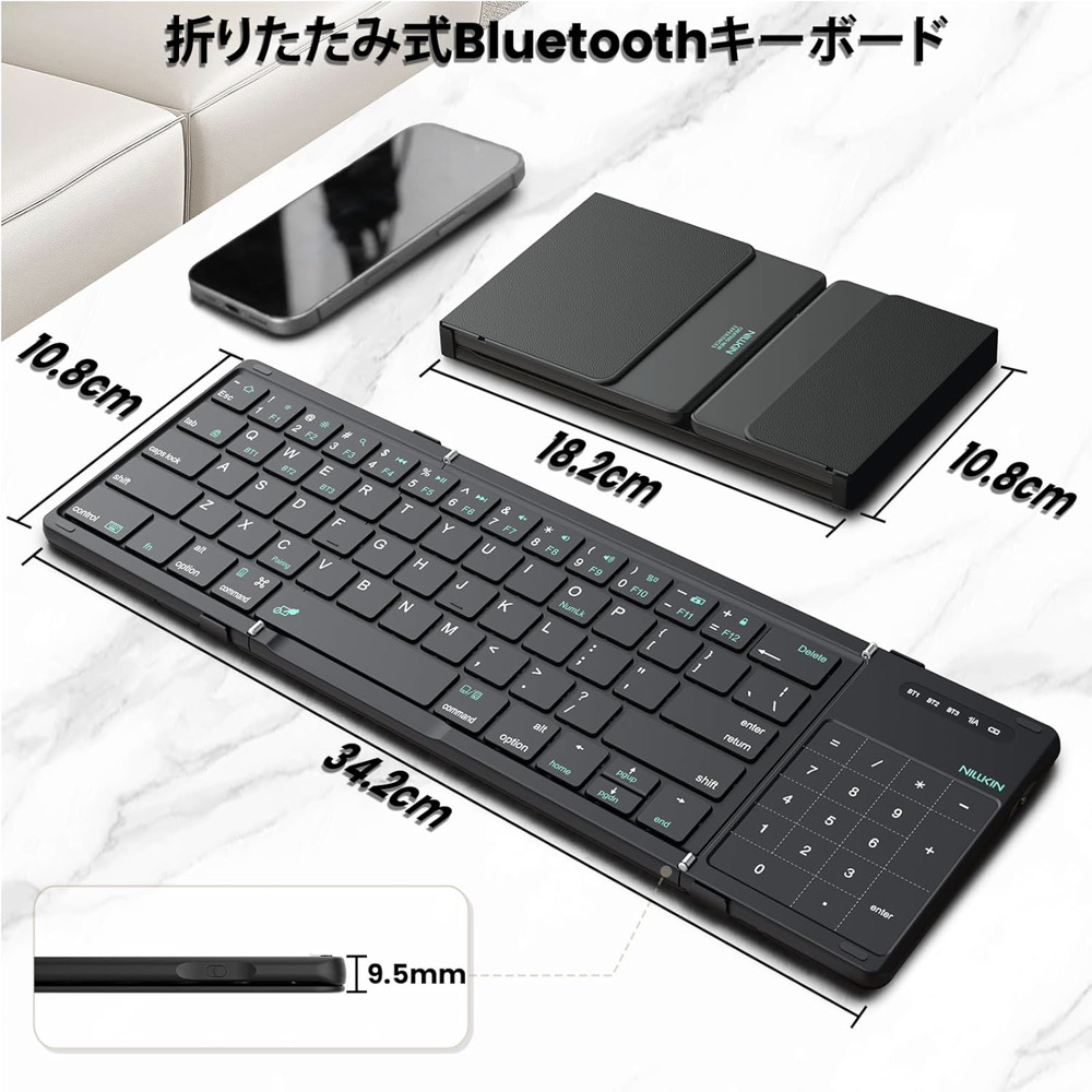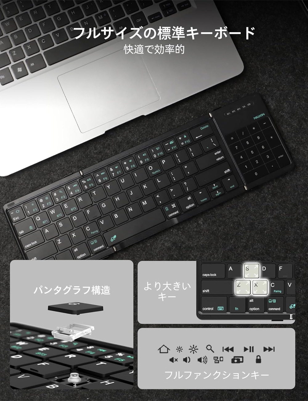 | キーワード | キーボード Bluetooth 折りたたみ式 ワイヤレス iPad用 無線 【タッチパッド&テンキー2 in 1】 三台同時接続 iOS/Android/Mac/Windows対応 Type-C充電式 アンドロイド スマホ用 ipad mini 小型 コンパクト 静音性 軽量薄型 ミニキーボード 持ち運び 省スペース旅行・出張最適 日本語説明書付き ipad a16/10世代、ipad air、iPad pro、iPad mini、galaxy z fold 7、MacBook pro |
