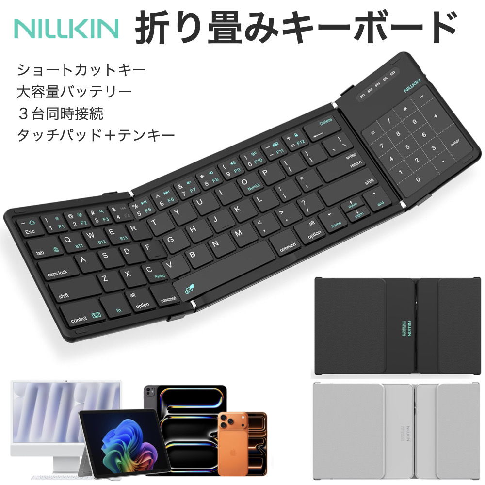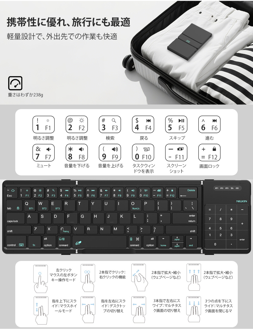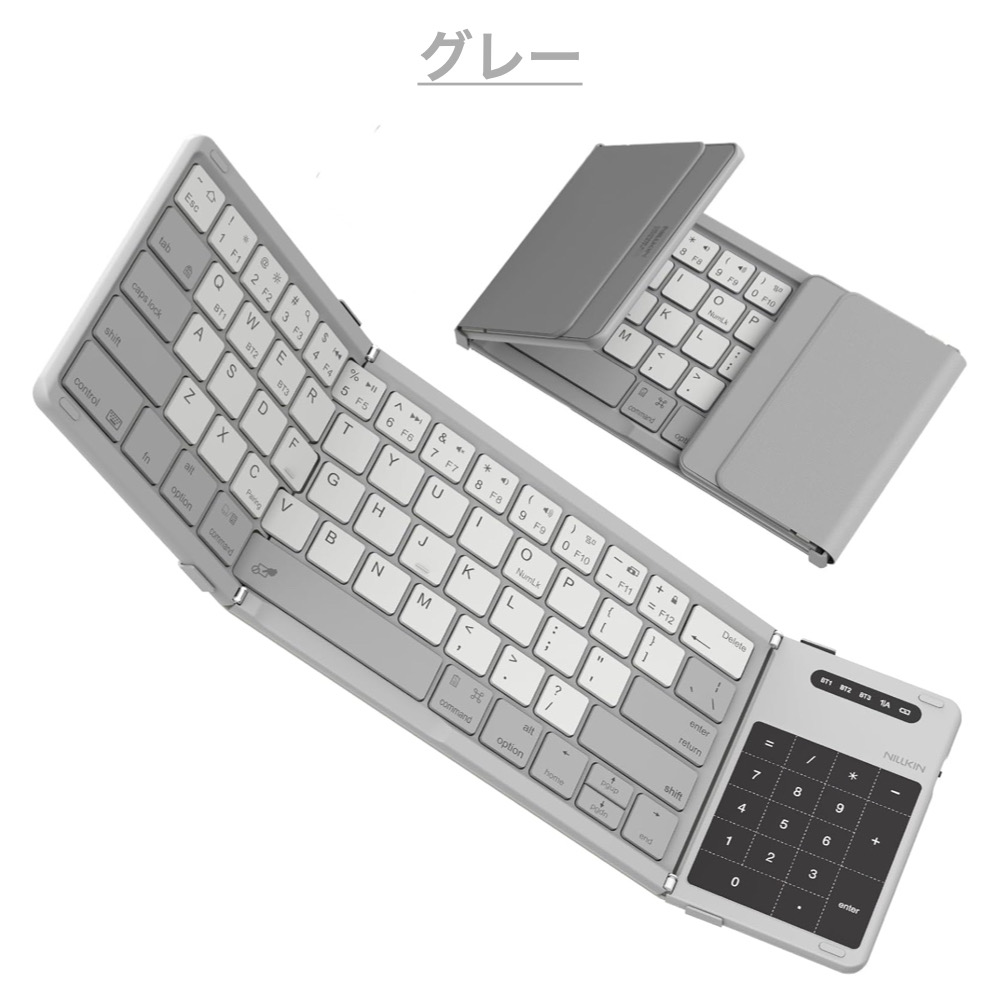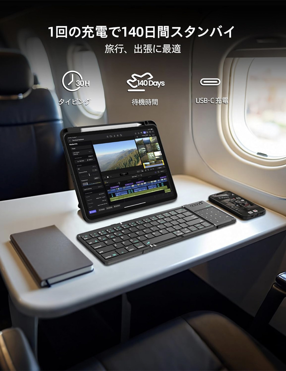 | キーワード | キーボード Bluetooth 折りたたみ式 ワイヤレス iPad用 無線 【タッチパッド&テンキー2 in 1】 三台同時接続 iOS/Android/Mac/Windows対応 Type-C充電式 アンドロイド スマホ用 ipad mini 小型 コンパクト 静音性 軽量薄型 ミニキーボード 持ち運び 省スペース旅行・出張最適 日本語説明書付き ipad a16/10世代、ipad air、iPad pro、iPad mini、galaxy z fold 7、MacBook pro |