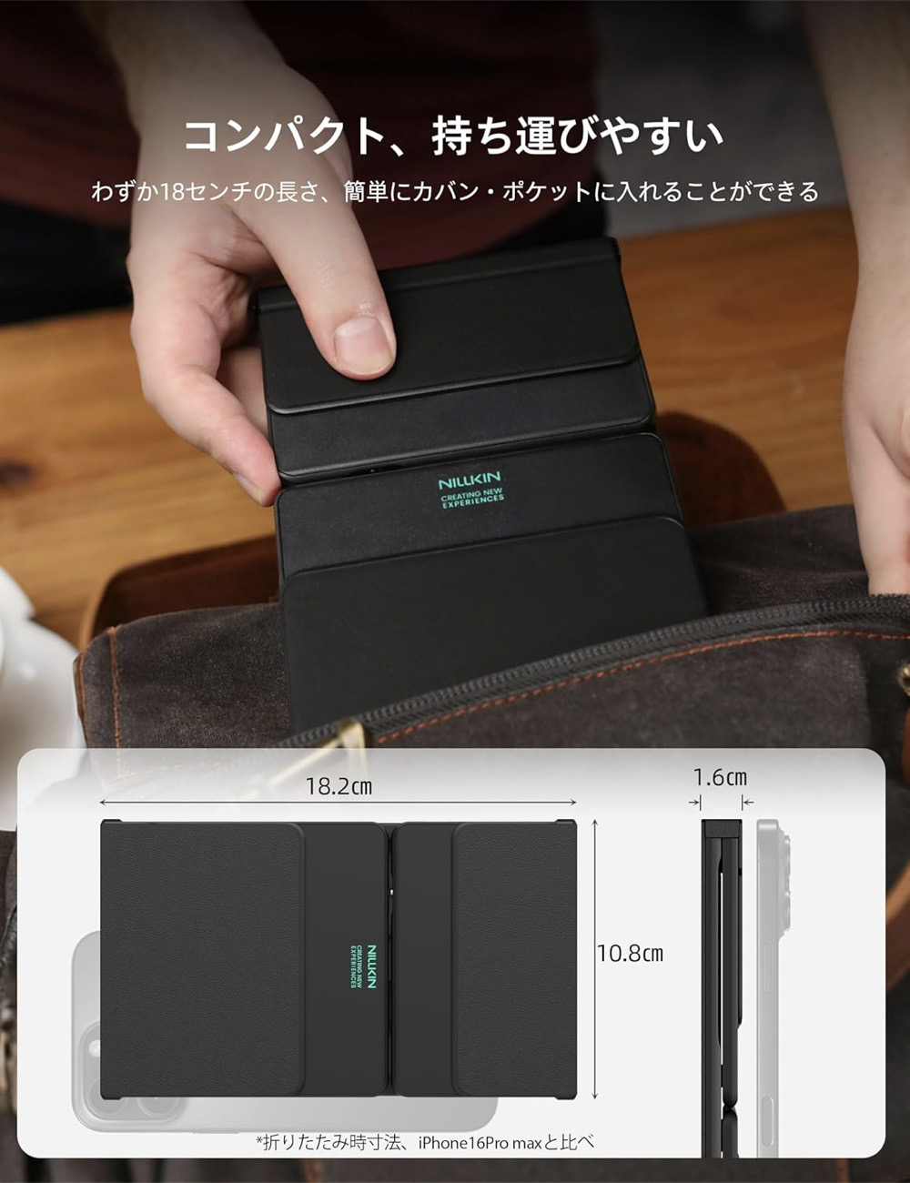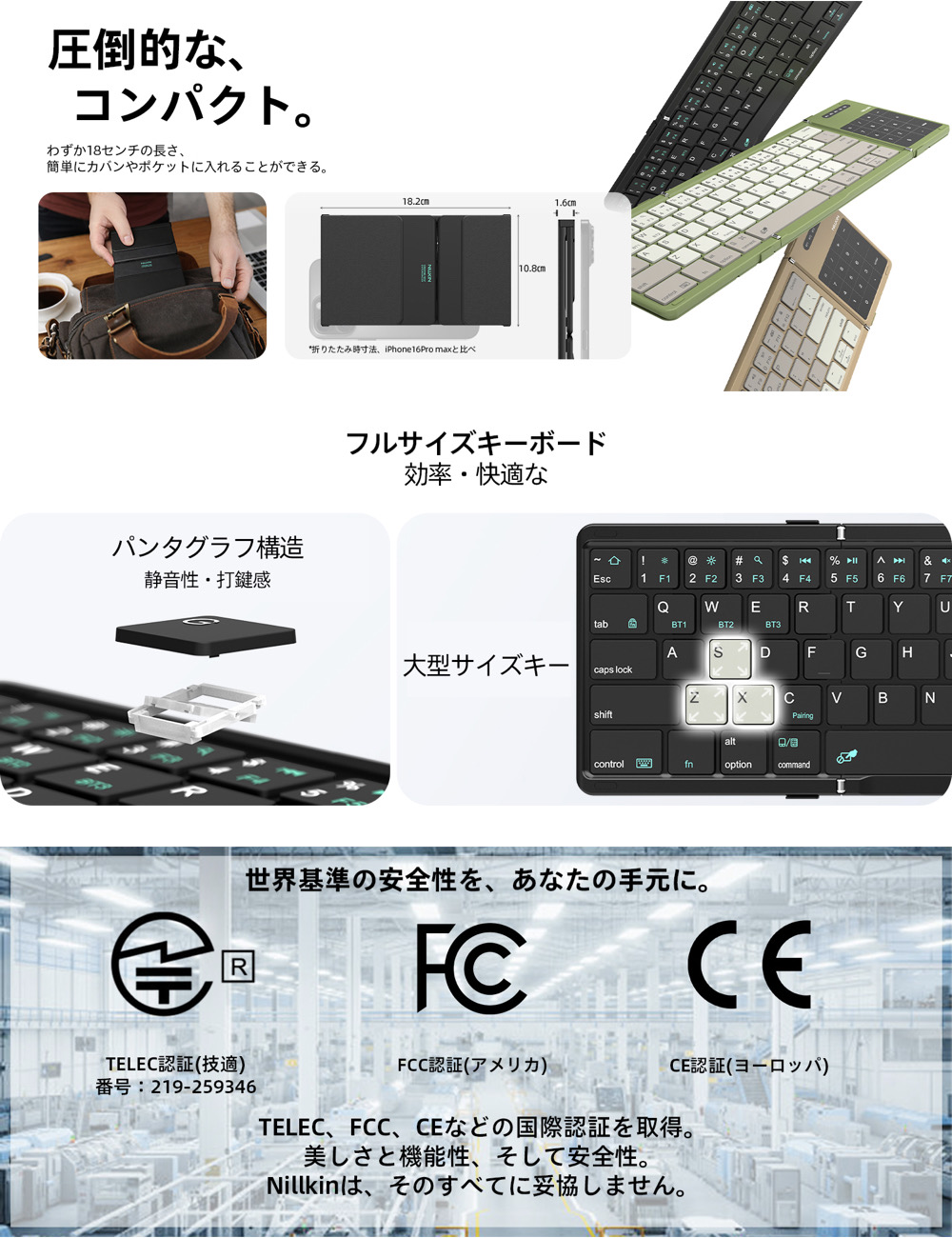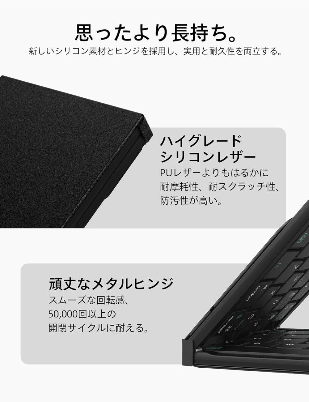 | 折り畳みキーボード | 【コンパクト&高機能】 折りたたむとわずか182×108×16mm、重さ238gとスマホ並みのサイズで、カバンやポケットにも収まる小型キーボード。広げると342×108mmのフルサイズ bluetooth キーボードに変身し、快適なタイピングを実現します。外出先でも生産性を落とさず、スマホ用キーボードとしても最適です。 【タイピングが快適】 パンタグラフ構造のキーを採用したミニキーボードながら、しっかりとした打鍵感と反応速度を確保します。キーボード コンパクトながらも標準US配列&ファンクションキー搭載で、ビジネスから日常利用まで幅広く対応します。軽量で扱いやすく、無線キーボード初心者にもおすすめです。 【3台同時接続・自動識別対応】 最新Bluetooth5.0チップを搭載し、最大3台のデバイスに同時接続可能です。電源を入れるだけで自動再接続&OS自動認識、Windows/Mac/Android/iOS/iPadOSなど、幅広い端末に対応し、ipadやスマホのキーボードとしても最適です。 【超長時間スタンバイ・急速充電対応】 140mAhバッテリーは、省電力設計により待機最大140日&連続30時間使用を実現。5V/2Aの高速充電に対応しており、わずか30分でフル充電可能です。モバイルキーボードとして日常使用にもビジネス用途にも対応し、旅行や外出先で安心して使えます。 【高耐久】 背面は傷に強いシリコンレザー仕上げ、ヒンジ部には高耐久金属を採用し、50,000回以上の折りたたみにも耐える設計です。スタイリッシュなデザインと質感は、贈り物にも最適。カラーも落ち着いており、男女問わず使いやすい印象です。 【タッチパッド+テンキー】 59×64mm(約3.4インチ)の大型タッチパッドは、ブルートゥース キーボードでありながら、スクロール・ズーム・アプリ切替など多彩なマルチジェスチャーに対応(※iOS/macOS一部制限あり)。テンキーへの切替も可能で、数値入力にも便利です。 |