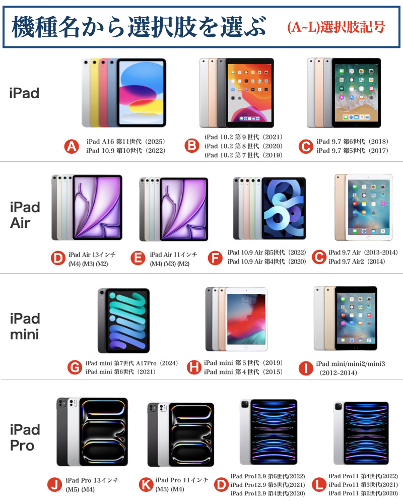 | サイズ | ・iPad Air 13インチ (M4,2026)(M3,2025)(M2,2024)※iPad Pro 12.9インチ(第6/5/4世代)と兼用ケースとなります。カメラカットアウトはスクエアタイプとなります。 ・iPad Pro 11インチ (M5,2025)(M4,2024) ・iPad Pro 13インチ (M5,2025)(M4,2024) ・iPad 第11世代 (A16) / iPad 第10世代 ・iPad 第11世代 (A16) / iPad 第10世代 ・iPad 10.2インチ 第9世代/第8世代/第7世代 ・iPad 9.7インチ 第6世代/第5世代 ・iPad Air 11インチ (M4,2026)(M3,2025)(M2,2024) ・iPad 10.9インチ Air5 ・iPad 10.9インチ Air4 ・iPad 10.5インチ Air3 ・iPad Air2 ・iPad Air ・iPad mini 第7世代(A17 Pro) ・iPad mini6 ・iPad mini5 ・iPad mini4 ・iPad mini3 ・iPad mini2 ・iPad mini ・iPad Pro11インチ(2022/2021/2020) ※サイズが多種ございます。 『iPad識別画像』をご確認くださいませ。 |