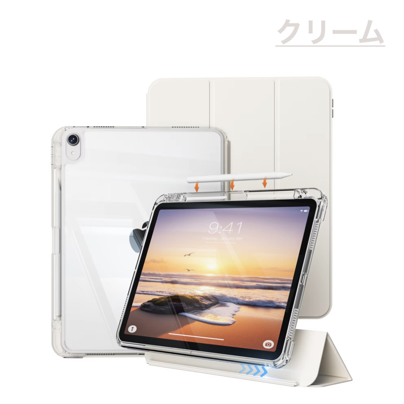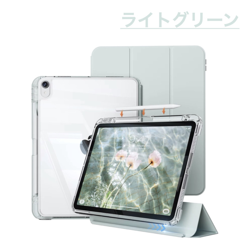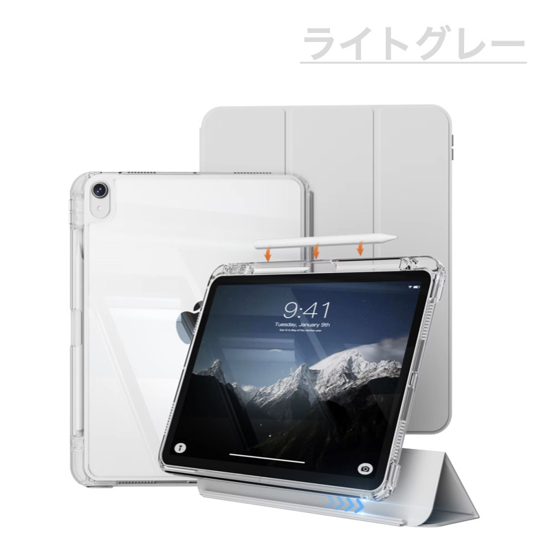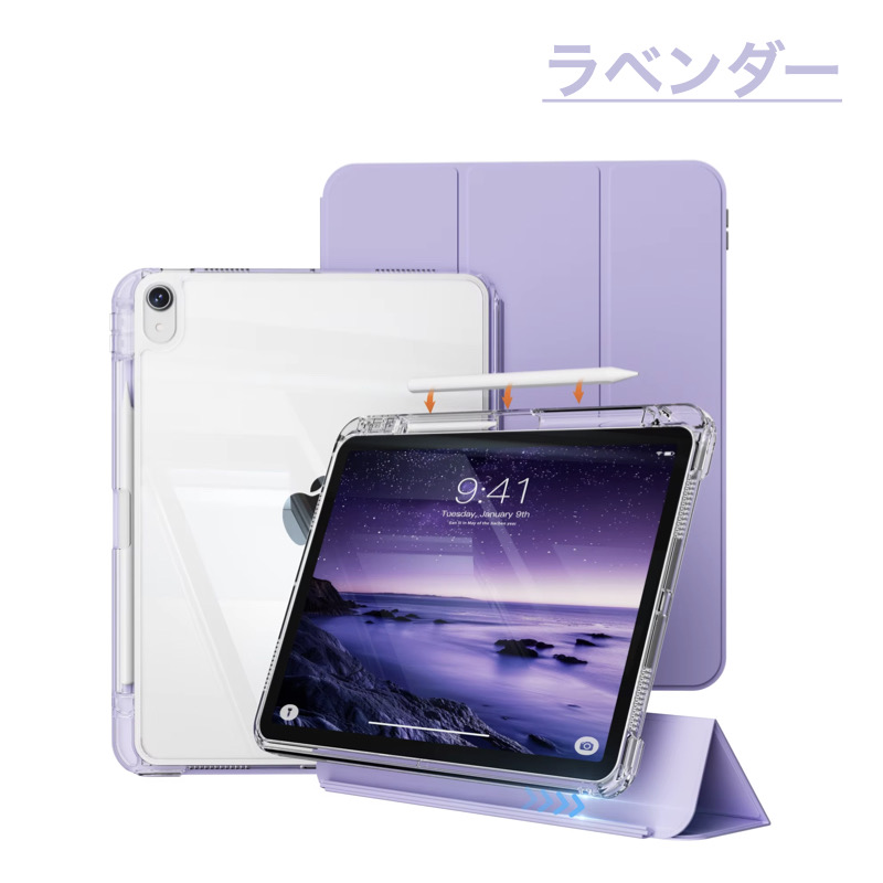 | iPad ケース | 【Apple Pencilユーザーのためのケース】 サイズぴったりのペンホルダーはもちろん、 キャップ・アダプタ用のホルダーやペン立ても付いた、Apple Pencilの使用に最適なケースです。 ※Apple Pencilは付属しません。 【スライド着脱式フロントカバー】フロントカバーは簡単に着脱することができ、自由に手軽にiPadを持ち運ぶことができます。フロントカバーを三角に折り畳むことによって、iPadを縦置き、横置きにして動画視聴やゲームを楽しむことができます。 【三つ折りフロントカバー】 風呂ふた仕様の三つ折りのフロントカバーは、高品質なPUレザー素材で仕上げられており、この価格では想像できないおしゃれで高級感のあるケースになっています。 三つ折りフロントカバーには、複数のマグネットが均等に内蔵されています。 【安定したスタンド機能】 フロントカバーに内蔵された複数のマグネットにより、安定したスタンド機能をご利用いただけます。 タイピングや動画視聴などiPadを立ててご使用の際に、とても便利にご利用いただけます。 【オートスリープ機能】 オートスリープ機能で、バッテリーが無駄に消費してしまうのを防ぎます。 |