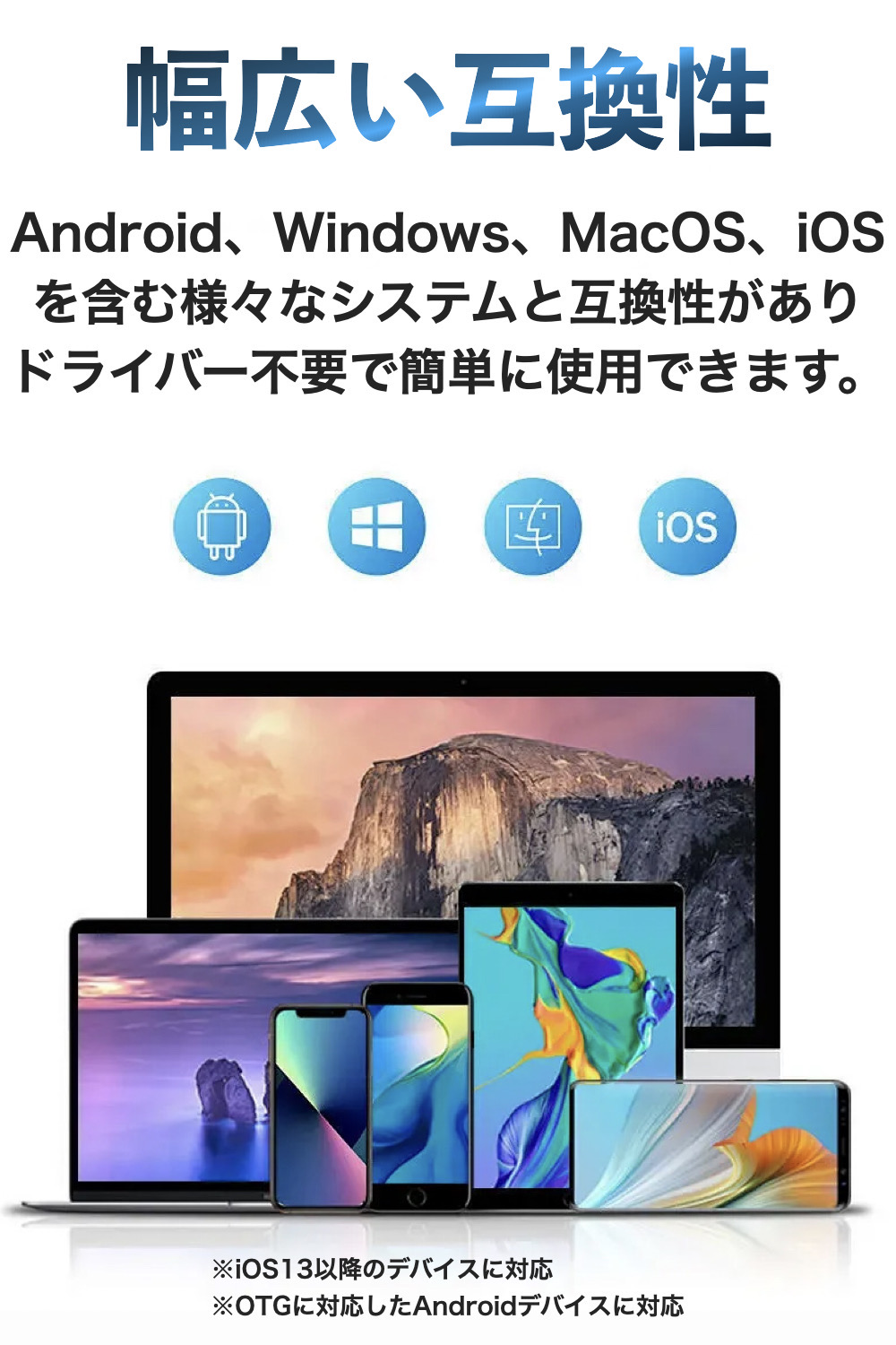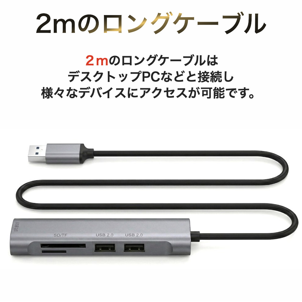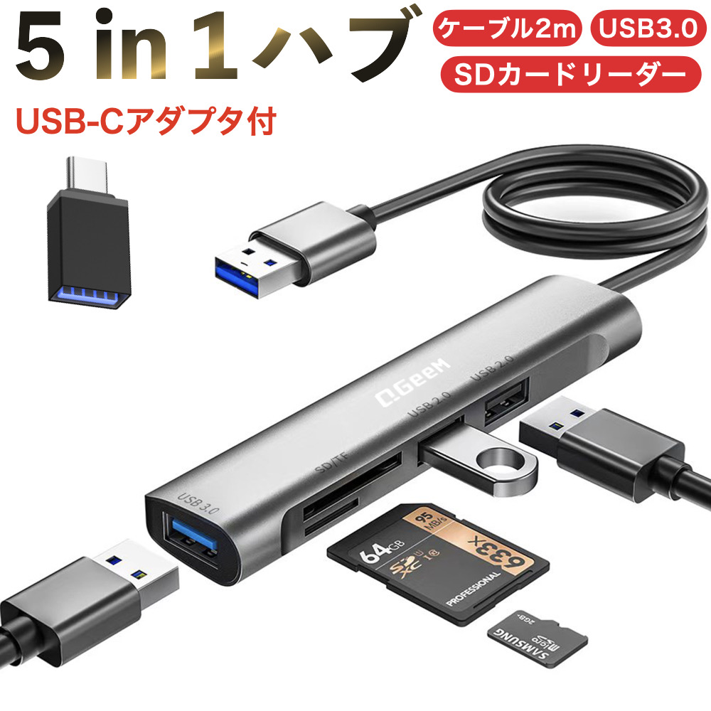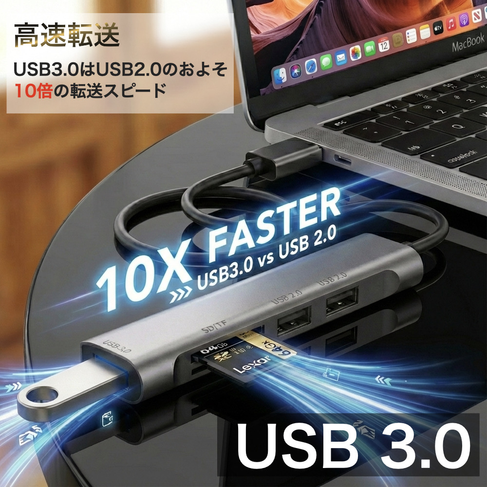 | 5in1ハブ | 【2mの超ロングケーブル】 2mの超ロングケーブルを兼ね備え、遠い位置にあるデスクトップへの接続や、ハブの移動が簡単で便利に使用できます。 【USB 3.0】 5Gbps転送&プラグとプレイ:5GbpsまでのダウンストリームUSB 3.0 Super-Speedインターフェイス転送速度。最大5Gbpsの転送速度をサポートします(USB 3.0) 480Mbps(USB 2. 0)、12Mbps(USB 1. 1)。プラグとプレイハブはユーザーフレンドリーです。 【幅広い互換性】 QGeeM USBハブはUSBフラッシュドライブ、マウス、キーボード、外付けハードドライブなどのUSB-A周辺機器で動作します。iMac、MacBook、MacBook Air、Mac Pro / Mini、Surface Pro、XPS、ノートブックPC、Windowsと互換性があります。 1/7 / Vista / XP、Mac OS X、Linux、Chrome OSなどに対応。 【精密設計のUSB ハブ】 Ultra Slim ハブは強化設計されたケーブルと耐熱端子により、高い保護性能があり、長くお使いいただけます。ご安心ください。 |