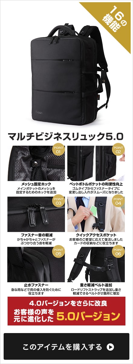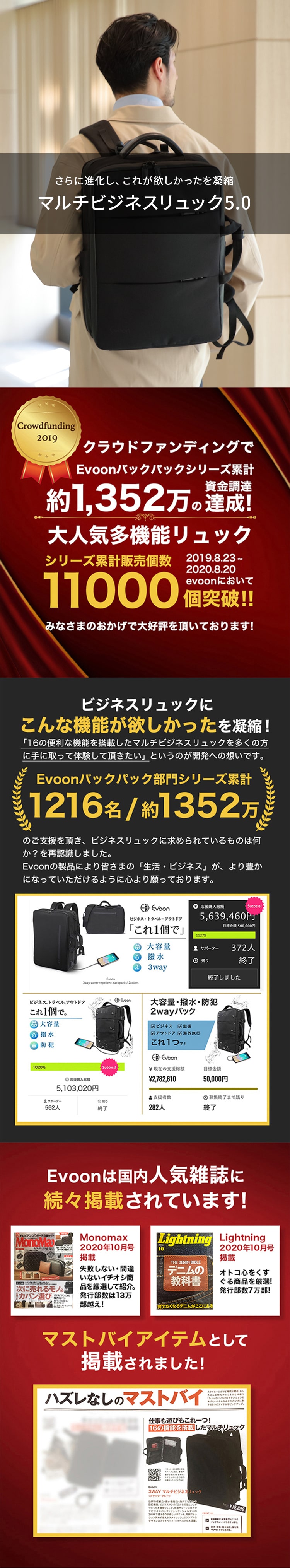 【Evoonマルチビジネスリュック5.0のサイズ・テーマ】