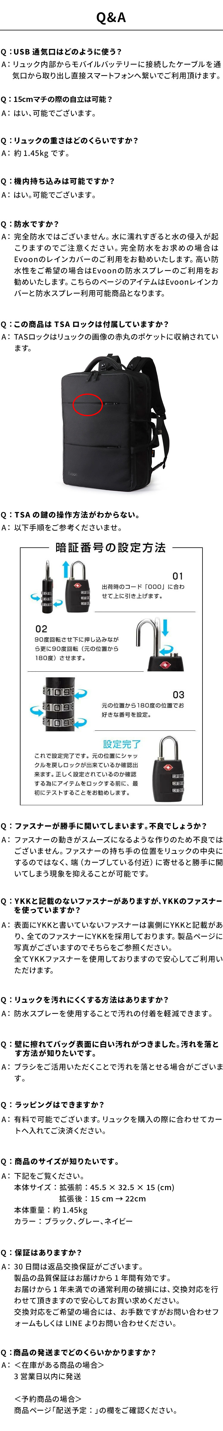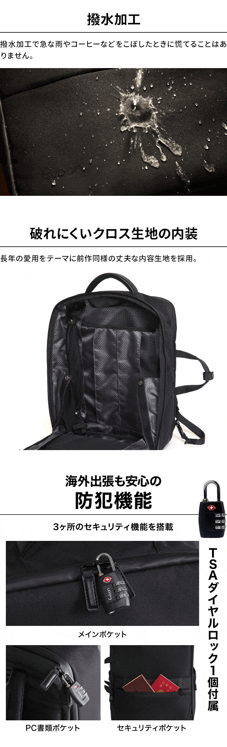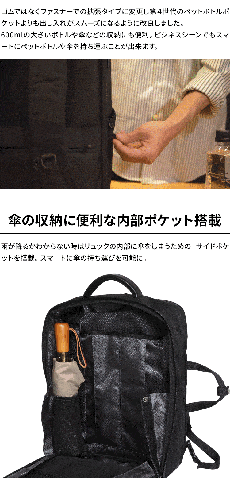 35Lで大容量/様々なシーンで利用可能/信頼のYKK止水ファスナー/クイックアクセスポーチ付属/クイックアクセスポケット/2WAY/重さ軽減ベルト×2/USB通気口/ペットボトルポケット×2/弁当箱の収納を考慮し設計/17.3インチまで対応PCポケット/拡張機能/破れにくい内装生地採用/防汚防傷撥水加工されたコーデュラ生地/内部に傘ポケット/180度開き中身が見えやすい等・バッグが大きすぎて、バッグの存在が目立ちすぎてしまうカンジを抑えつつ、便利な機能性、大容量にこだわりました。