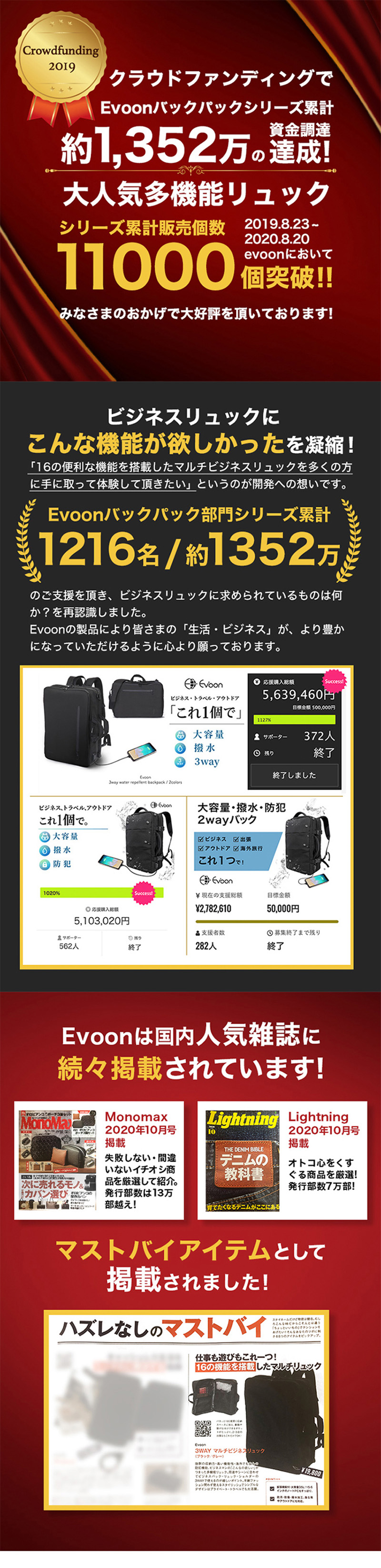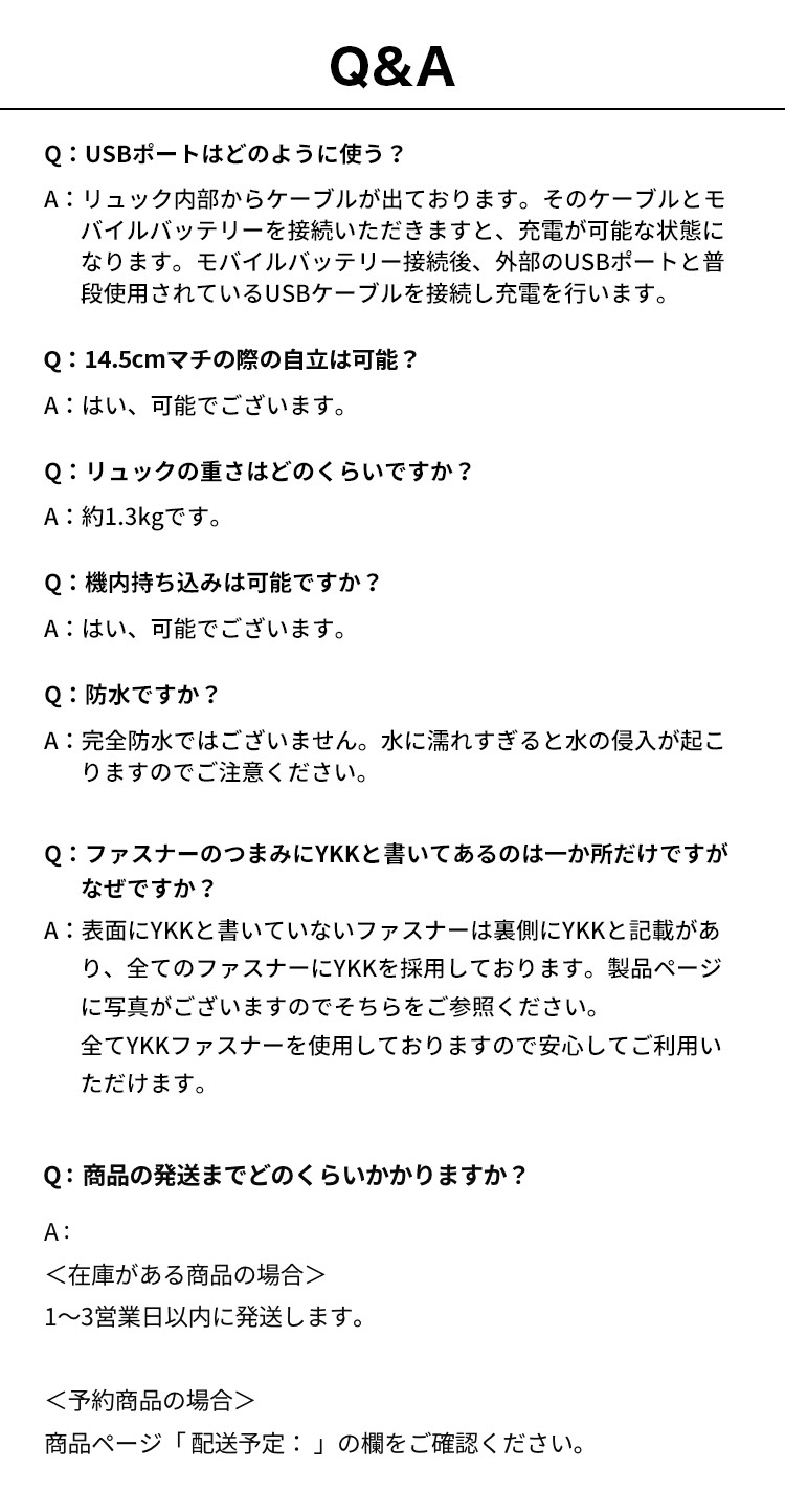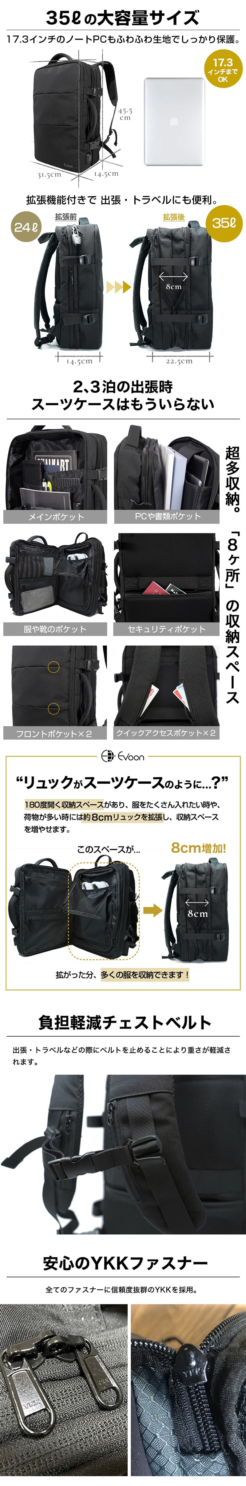 35リットルの大容量/180度開く収納スペース/4箇所の防犯機能/2WAYモデル/撥水加工/拡張機能/傷がつきにくい素材/安心のYKKファスナー/多収納/スーツケースのように使用可能/出張時にスーツケース不要/背面セキュリティーポケット付き/Suicaなどの出し入れ楽々ポケット/USBポート/スーツケース固定バンド/等・挙げ出したらきりがなくなってしまうくらい多機能バックを低コストで完成させました。
