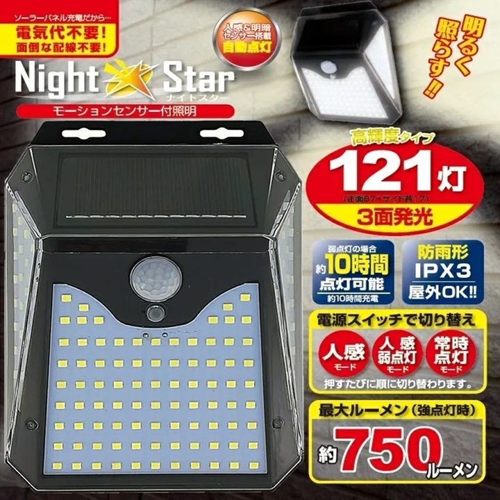 ソーラーライト センサーライト 屋外 ナイトスター 121灯 LED 明るい 人感センサー 防水 配線不要 自動点灯 簡単設置 おしゃれ 壁掛け