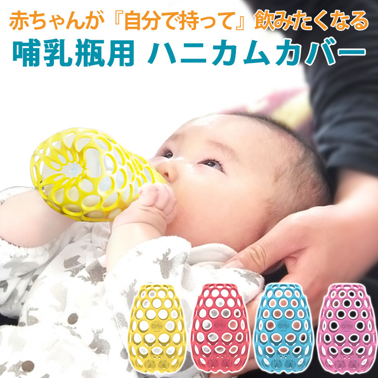 赤ちゃんが自分で持って飲みたくなる、哺乳瓶用ハニカムカバー。