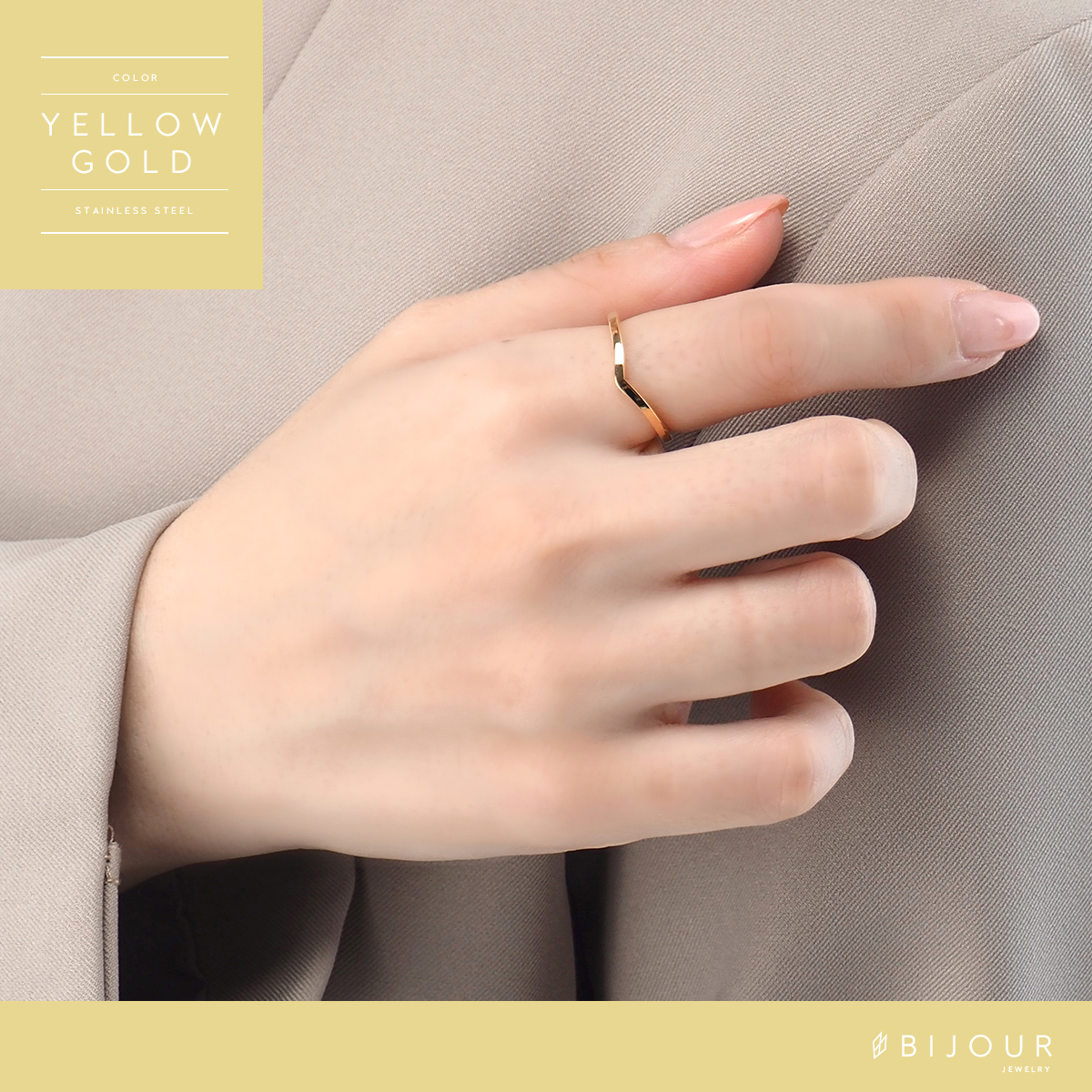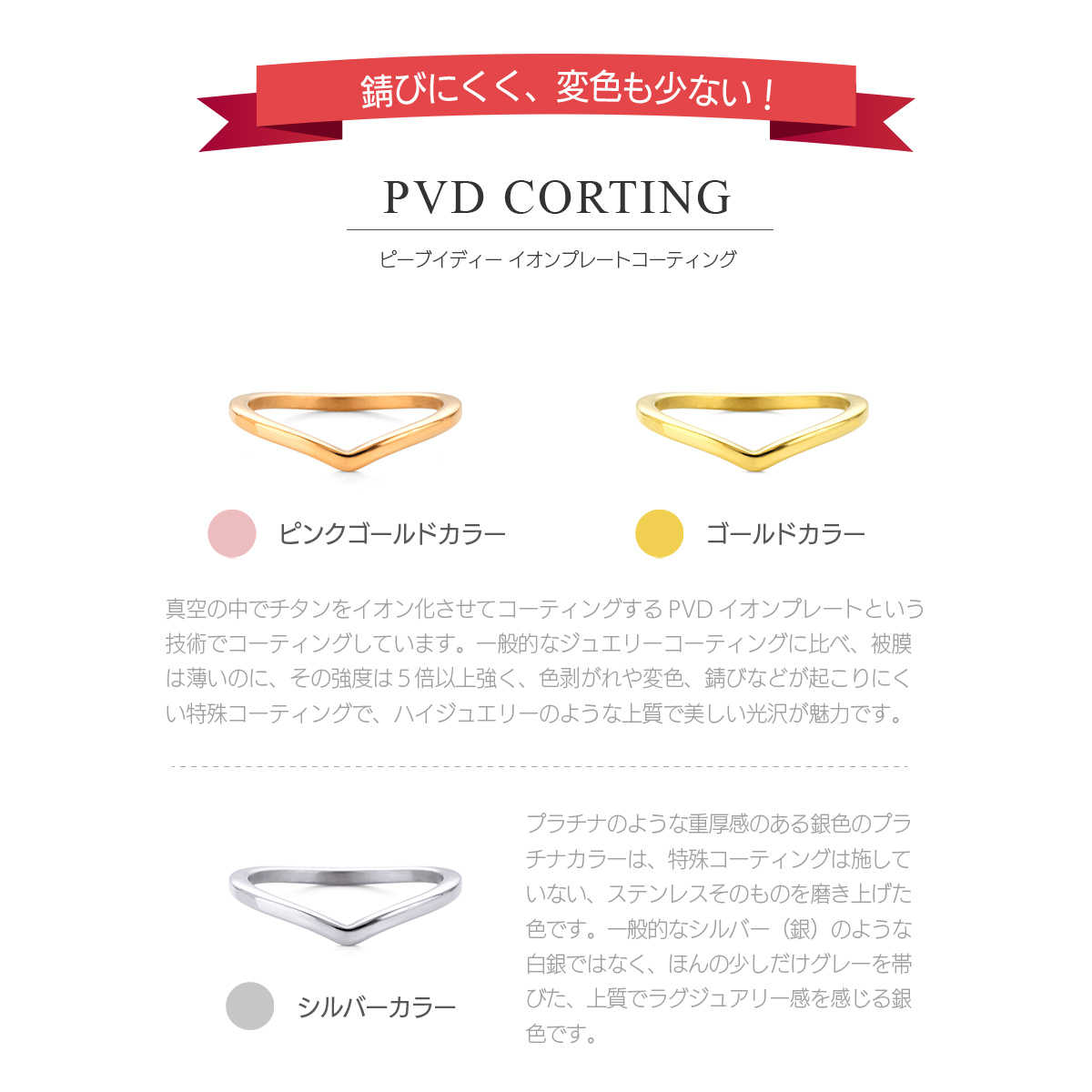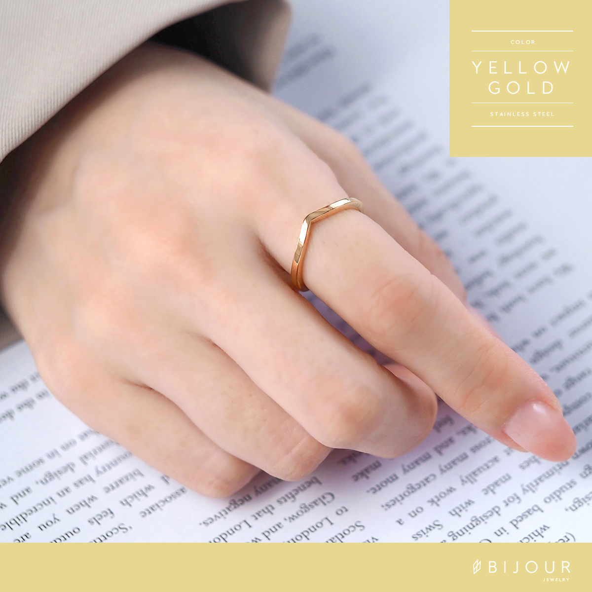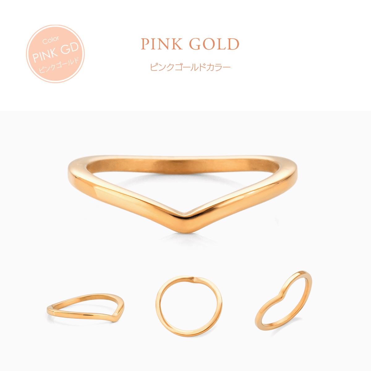 シンプルなv字リングです。柔らかな曲線のv字ラインが優しい印象のデザインで、指先を綺麗に見せてくれる柔らかい曲線が魅力。シンプルなのでデイリー使いにも最適。また、ステンレス製なので傷もつきにくく使いやすいので、金属アレルギーの心配も少なく、つけっぱなしもOKのリングです。