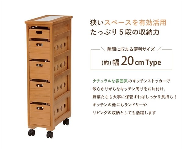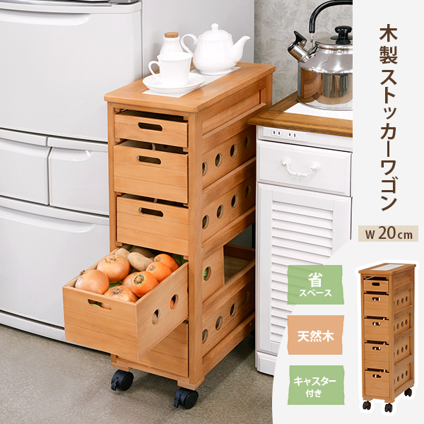 木製 キッチンストッカー 幅20 キャスター付き 完成品 スリム 木製ストッカー キッチン 収納 引き出し 安い おしゃれ 北欧 天然木 ナチュラル 爆買