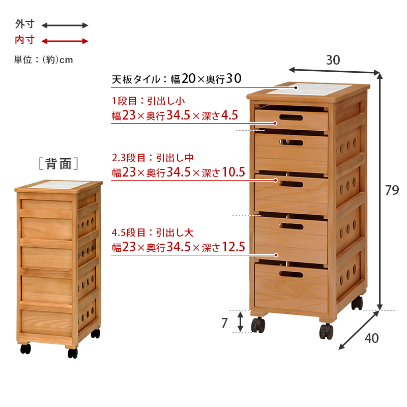 ■サイズ:(約)幅30×奥行40×高さ79cm/引出内寸:約幅23×奥行34.5×(浅)4.5(中)10.5(深)12.5cm