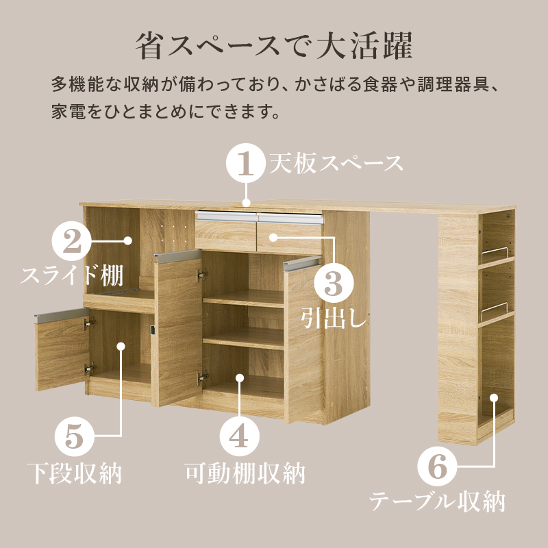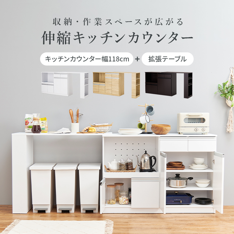 広がるキッチン作業スペース 伸縮 キッチンカウンター 幅118+拡張テーブル キッチンボード 作業台 収納 おしゃれ スライド キッチン収納 レンジ台 レンジボード