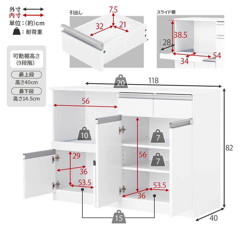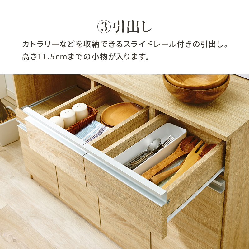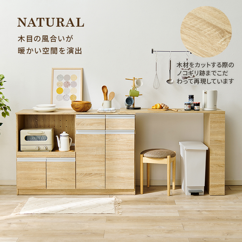 ■素材:主材:プリント紙化粧パーティクルボード、天板・スライド棚:合成樹脂化粧パーティクルボード(メラミン樹脂)、取手:スチール