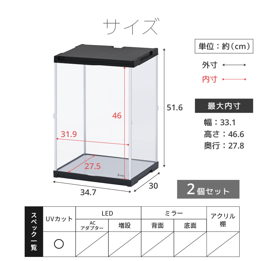 ※Jステージハイタイプの積み上げは2段までです。2段以上は転落や破損の恐れがありますのでおやめください。※アクリル面にアルコールを吹きかけると割れる場合がございます。お手入れには中性洗剤を水で薄くしたものをお使いください。