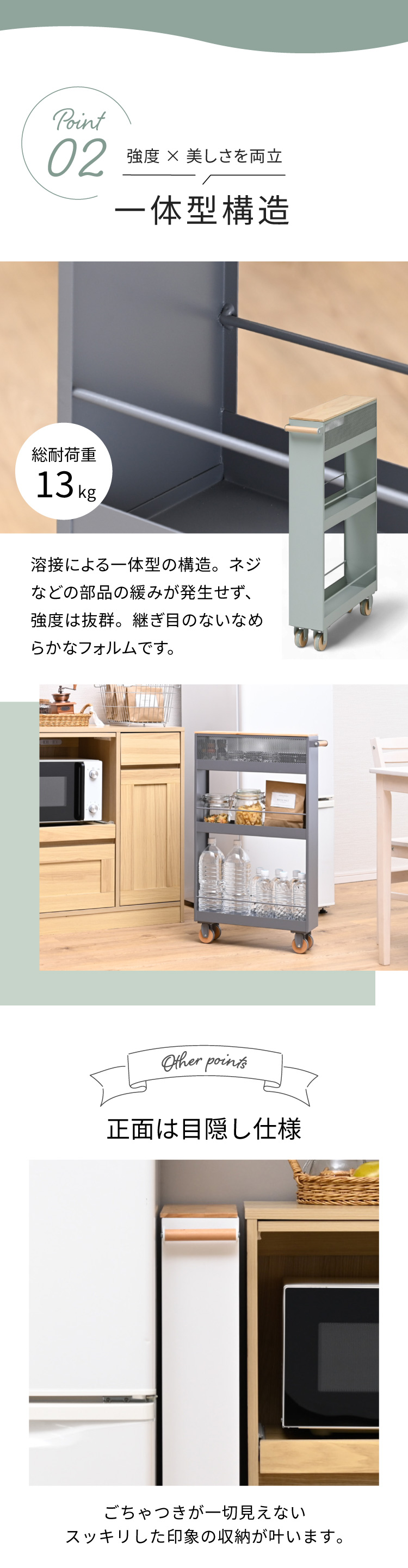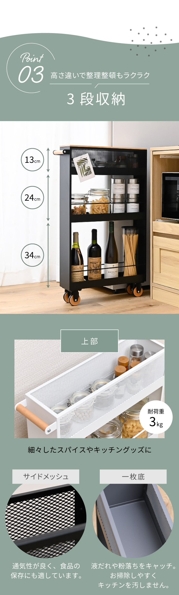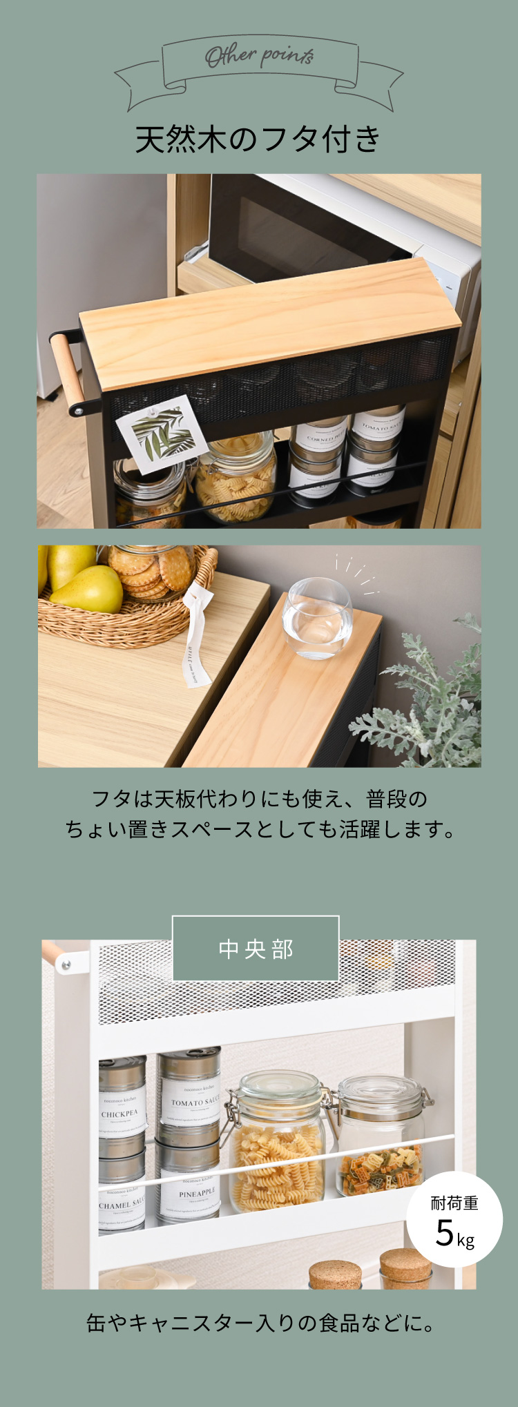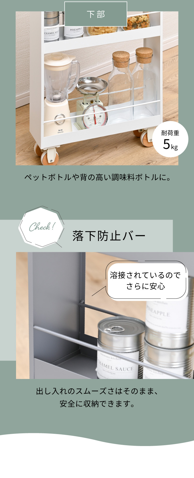 | 耐荷重 | ・収納上部:3kg ・収納中央部:5kg ・収納下部:5kg |