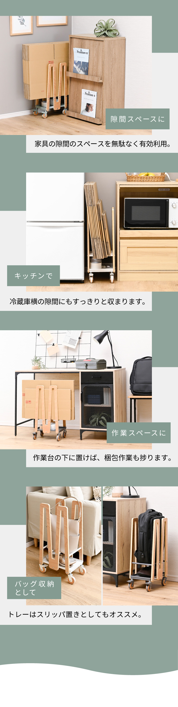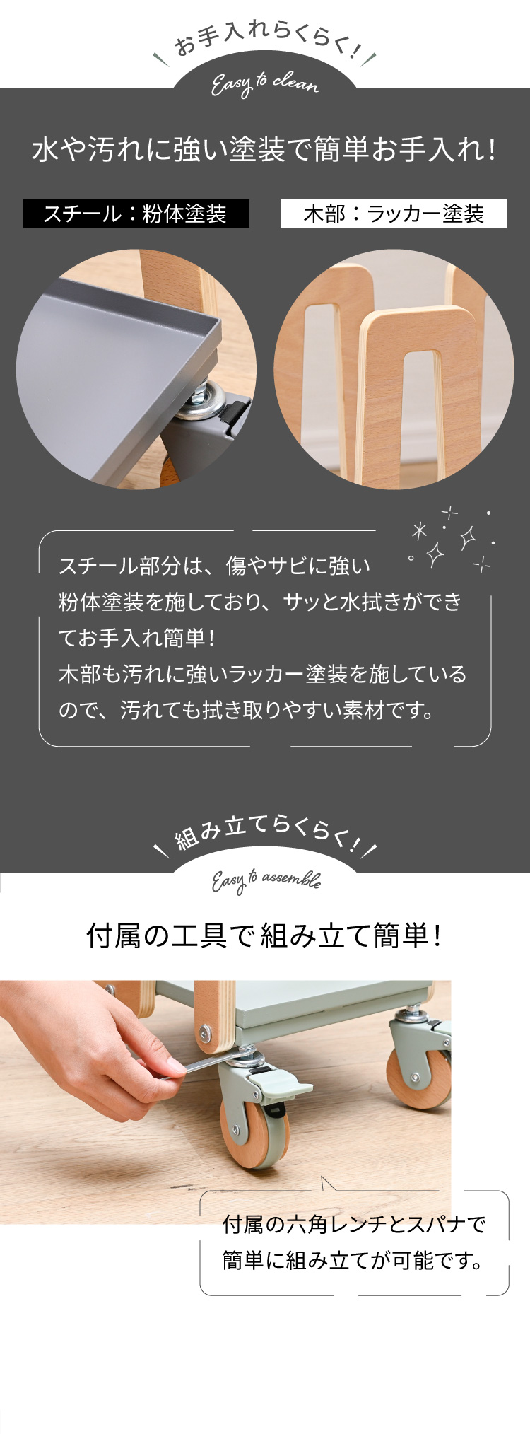 | 材質 | ・フレーム:積層合板 ・トレー・バー:鉄 ・キャスター:天然木・PU |