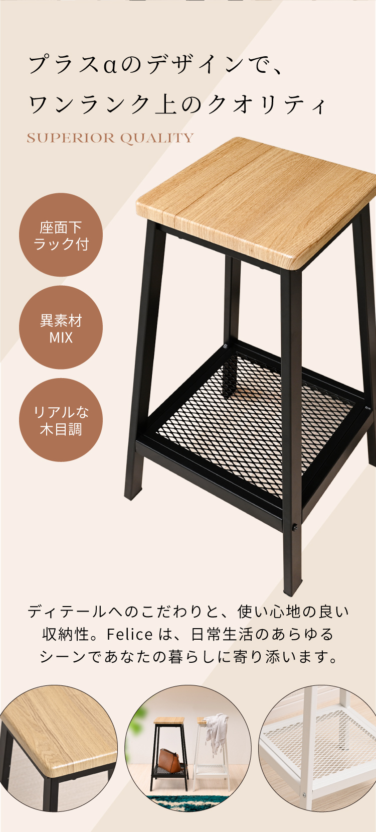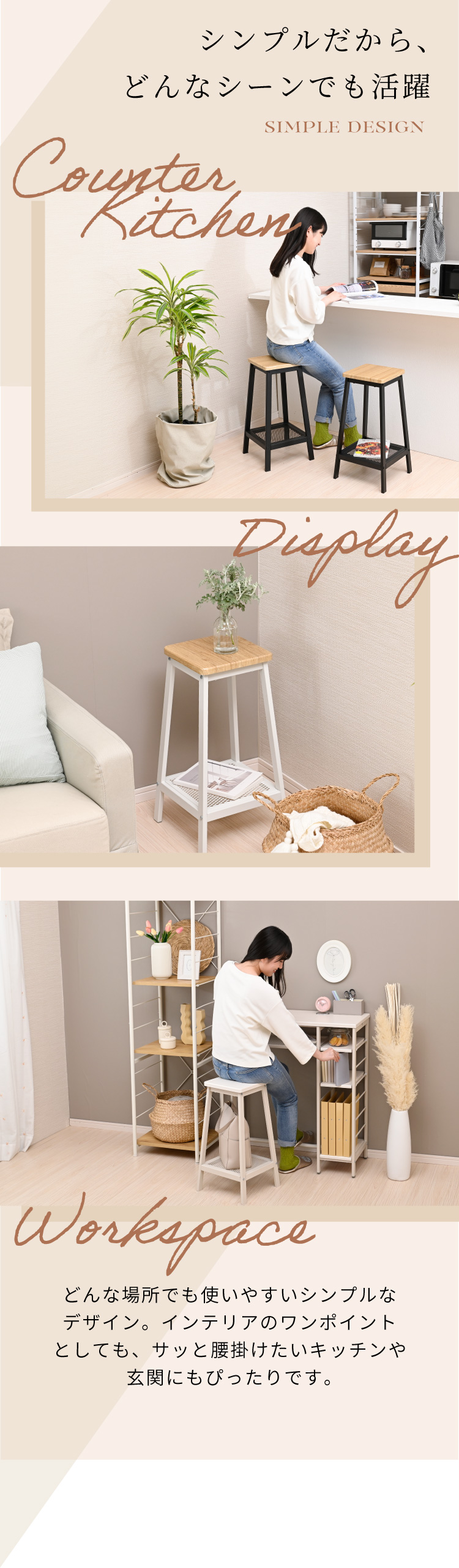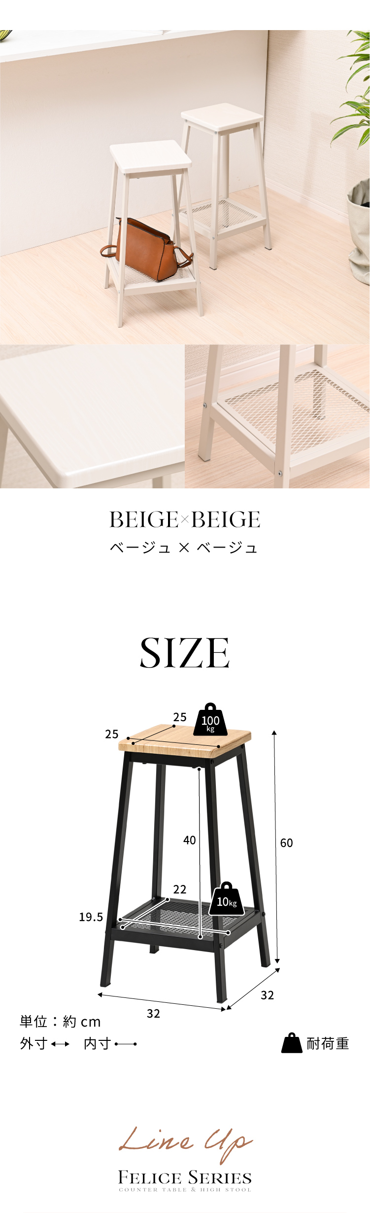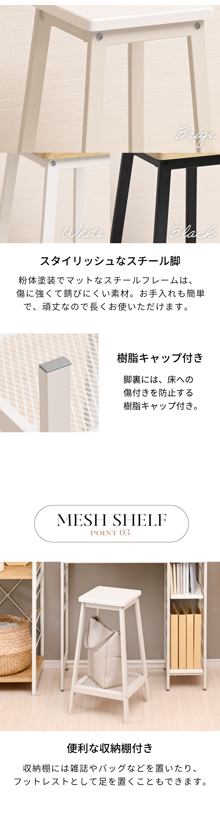 | サイズ | ・本体:幅約32×奥行約32×高さ約60cm ・座面:幅約25×奥行約25×板の厚み約2cm ・座面下メッシュ棚:幅約19.5(最大26)×奥行約22(最大29.5))×高さ約40cm |