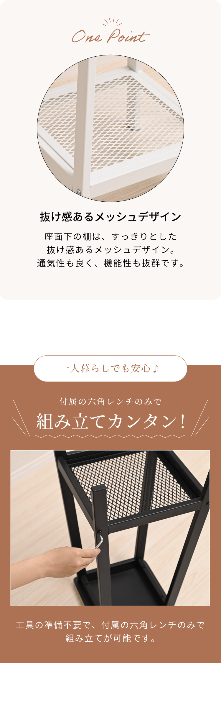 | 耐荷重 | ・本体:100kg ・座面下メッシュ棚:10kg |