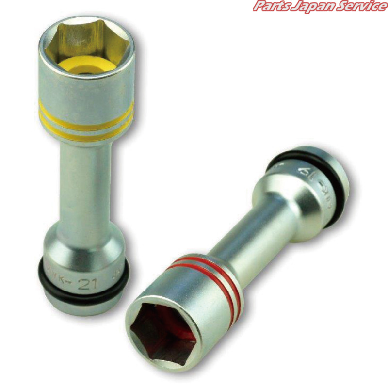 商品特徴:●ショートナット用に嵌合部を浅口にしてあり、ソケットの先端がホイールに接触しにくくなっている。ナットの頭部を傷つくのを防止する樹脂板付です。ボルトの逃げ穴をつけてあり、貫通ナットにも使えます。ホイルナット専用に特に薄型に設計しておりますので、早期に破損することがあります。