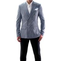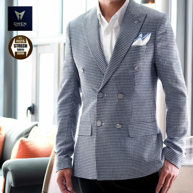 テーラードジャケット ダブル 銀ボタン ジャケパン 千鳥 千鳥チェック 千鳥格子 スリム ブレザー 6つボタン 紺/水 ストレッチ 春/夏/秋/ メンズ