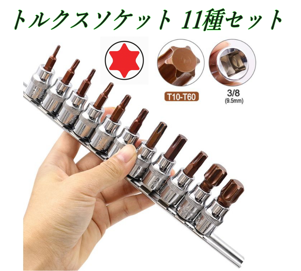 トルクスビットソケット, トルクスソケットセット, いじり止め, セキュリティトルクス, S2鋼, 3/8, 9.5mm, T10, T15, T20, T25, T27, T30, T40, T45, T50, T55, T60, ビットソケット, ソケットレンチ, ラチェット, 整備工具, 自動車工具, バイク整備, DIY, メンテナンス, プロ仕様, 工具セット, ホルダー付き, 強化鋼, トルクスビット