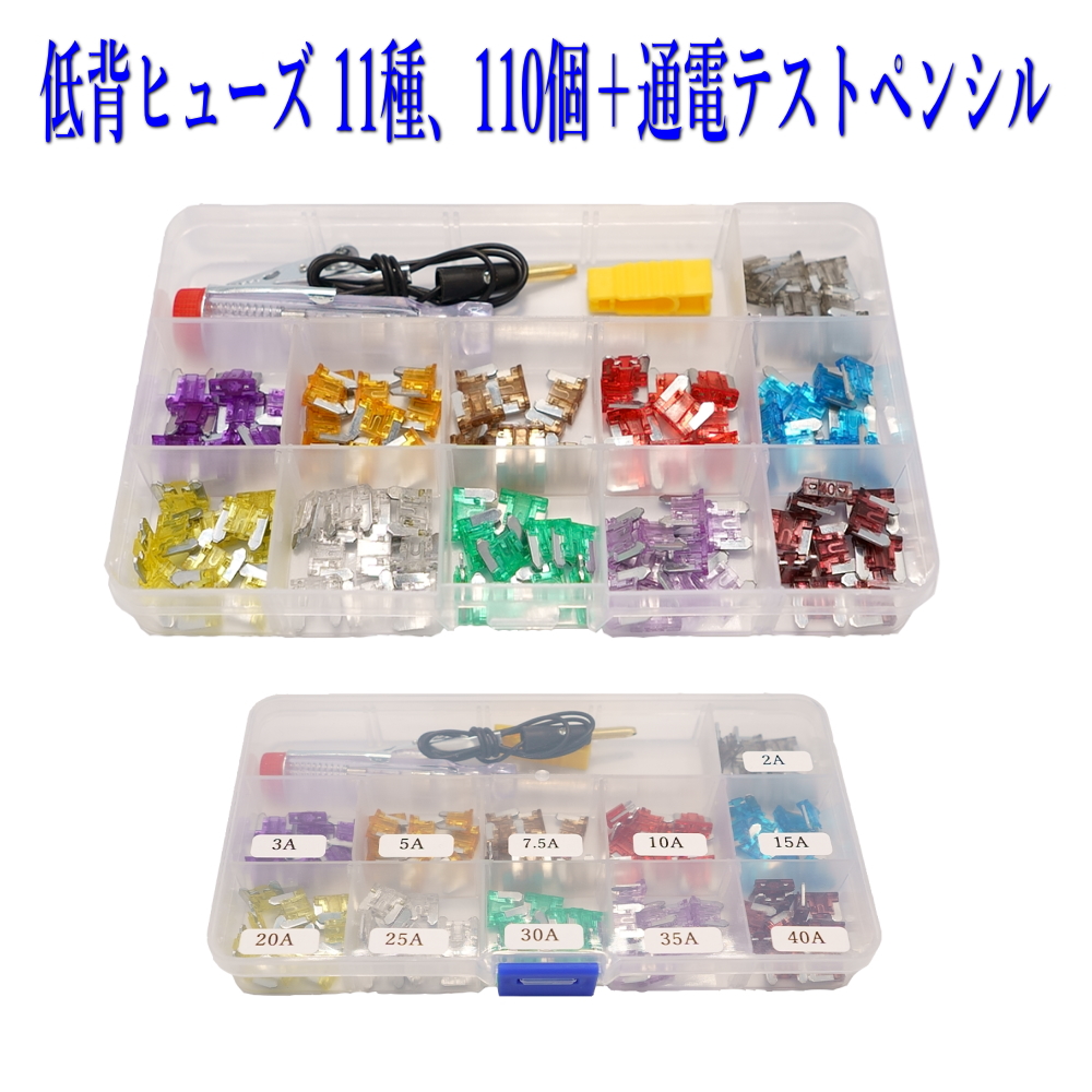 低背ヒューズ 11種、110個+通電テストペンシル セット BOX入り H1011-33