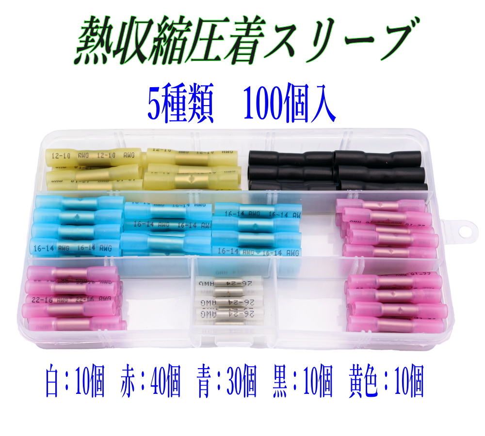 熱収縮圧着スリーブ 5種類 100個 26-10AWG 防水圧着端子 配線接続 絶縁端子 ハードケース入り