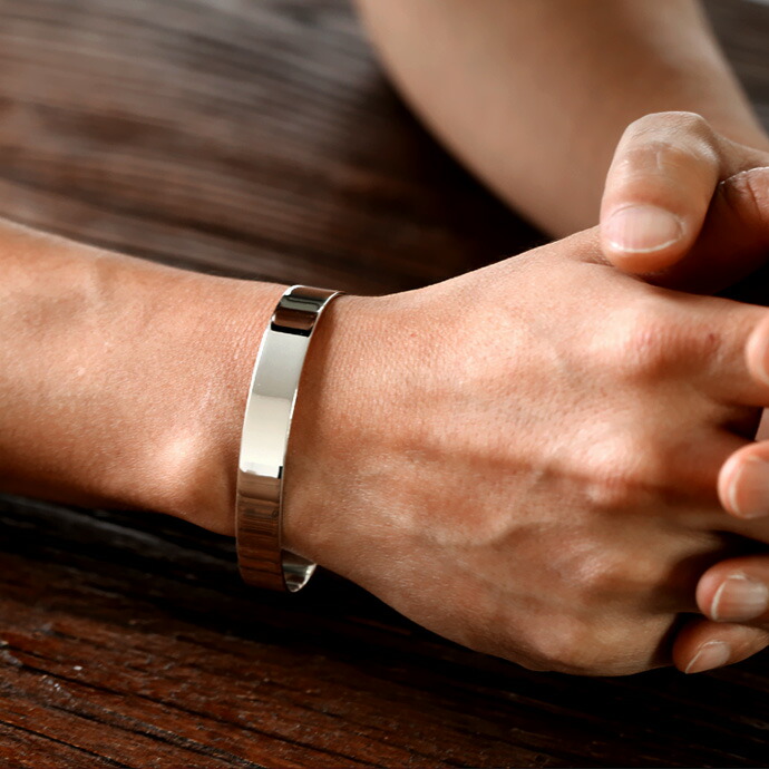 インパクト大の10mm幅で腕元を男らしく飾ることができる太めのバングルです。厚みが1.3mm程のため、邪魔に感じることが無く着けやすくなっています。合わせやすいのでヘビロテ確実、ひとつ持っておくと何かと使えてとても便利です。