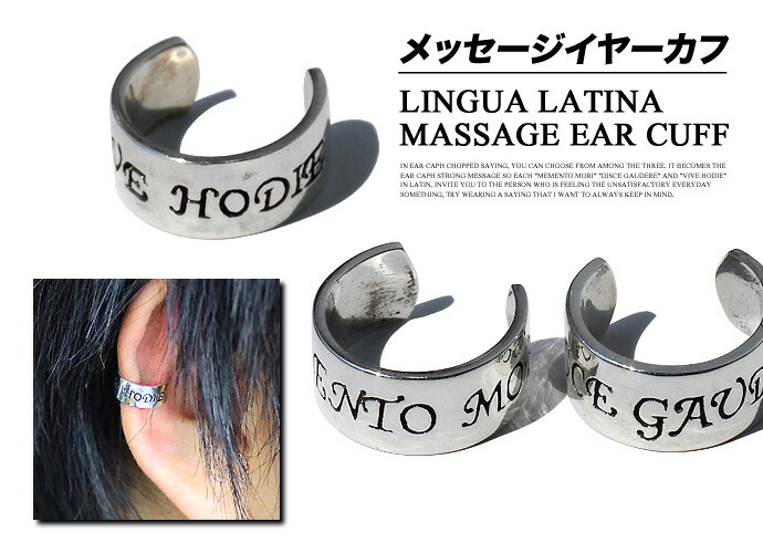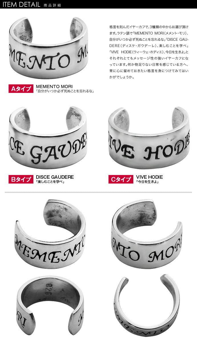 | 説明 | 格言を刻んだイヤーカフで、3種類の中からお選び頂けます。ラテン語で「MEMENTO MORI(メメント・モリ)、自分がいつか必ず死ぬことを忘れるな」「DISCE GAUDERE(ディスケ・ガウデーレ)、楽しむことを学べ」「VIVE HODIE(ウィーウェ・ホディエ)、今日を生きよ」とそれぞれとてもメッセージ性の強いイヤーカフになっています。何か物足りない日常を感じている方へ、常に心に留めておきたい格言を身につけてみてはいかがでしょうか。 |