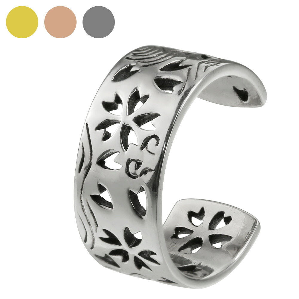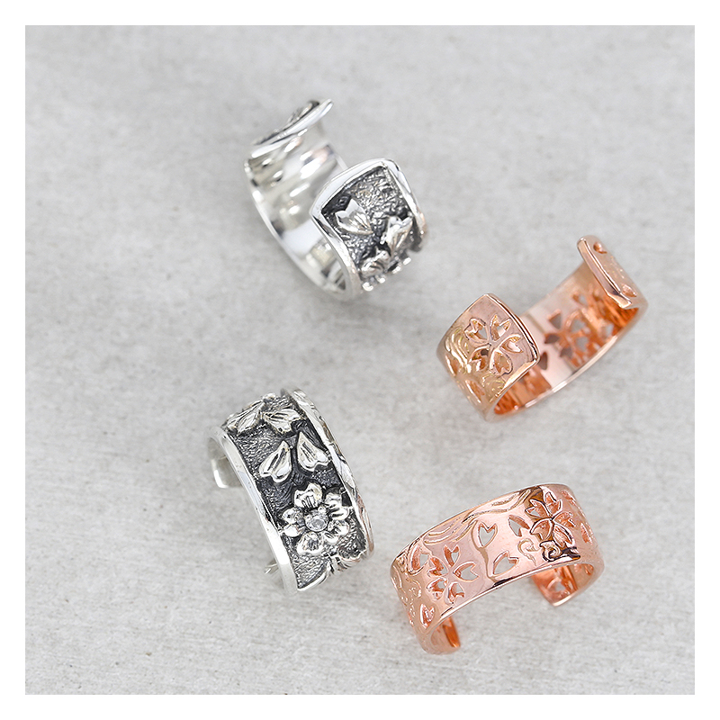 表面に無数の桜と花びらの透かし加工を施した和テイスト溢れるデザインのイヤーカフです。耳元を華やかに魅せるため、桜の季節には勿論のこと、オールシーズンでお使いいただけるシルバーアクセです。