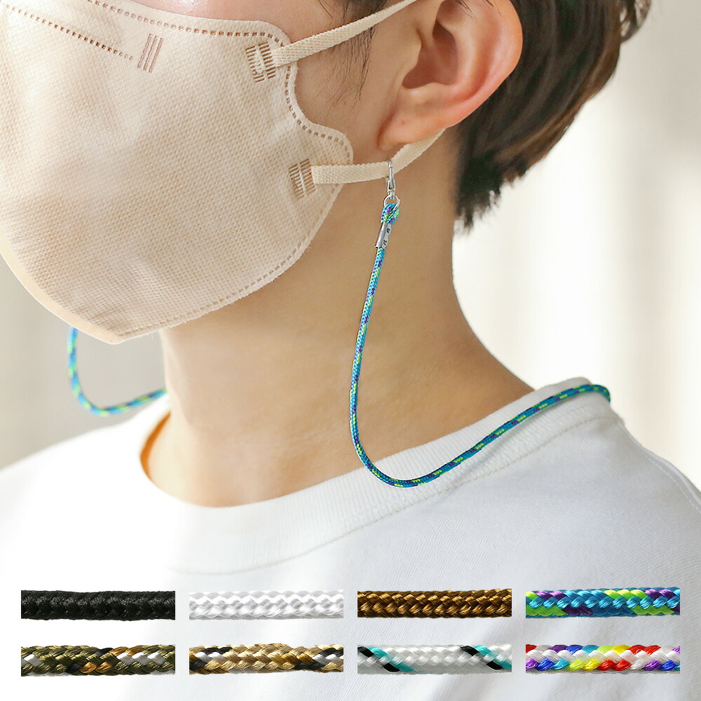 シンプルな色からパラコード風のデザインまで、種類豊富でカラフルなマスクストラップです。軽くて丈夫なポリエステル製コードを使用しています。首から下げられるので、置き場所に困らず無くす心配も無用。長さ調節用のパーツ付きです。