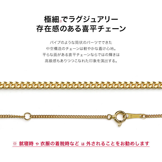 | 説明 | 全てが高級素材・K18ゴールド製の極細2面カット喜平チェーン。中空(ホロー)構造で作られており、着け心地は軽やか。細めのチェーンながら、ゴールドの高級感溢れる輝きがさりげなく、かつラグジュアリーに首元を演出する。 |