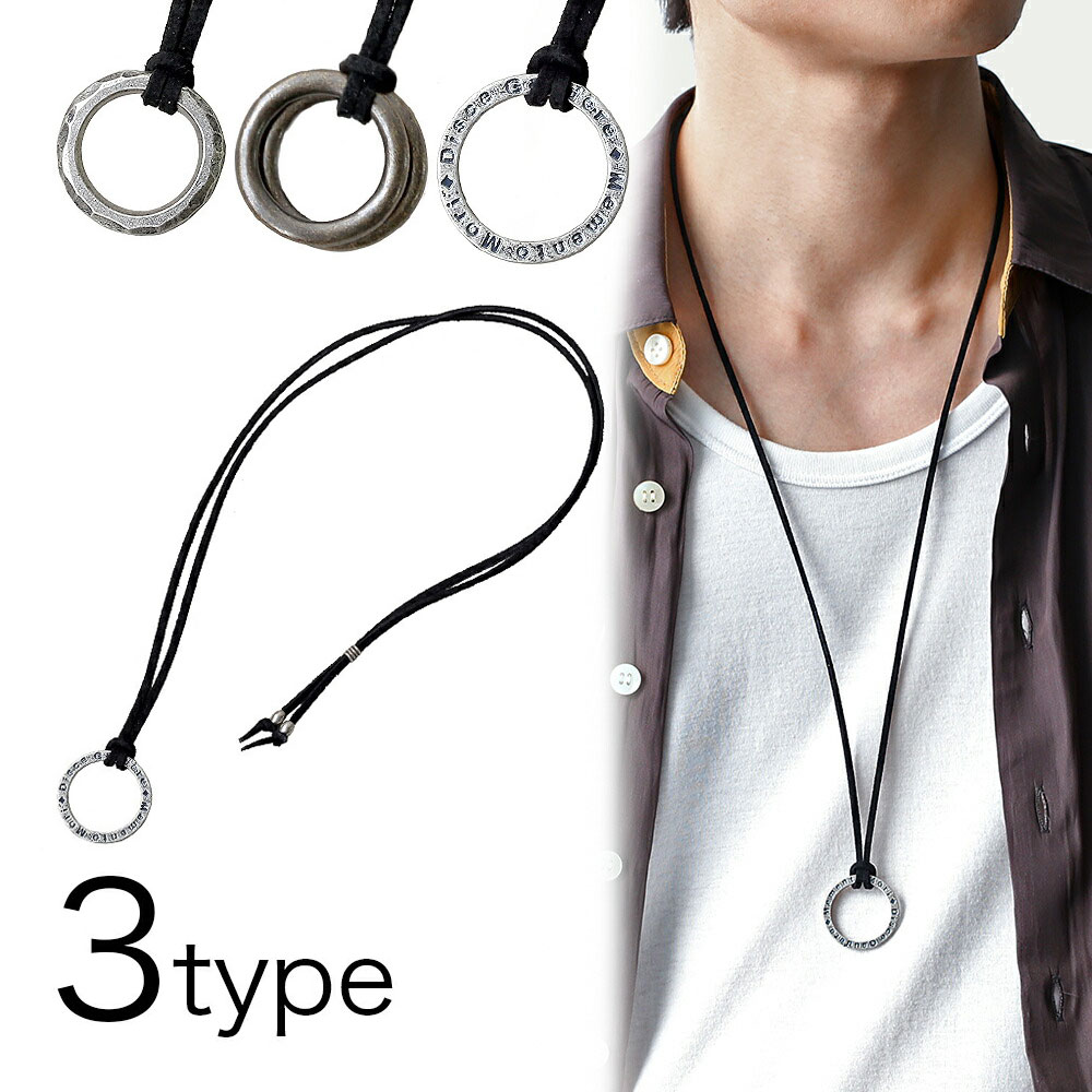 ■商品名:メール便送料無料 ネックレス メンズ ロング リング ネックレス フェイク レザー シンプル メッセージ 槌目 ダブルリング アンティーク風 オシャレ 重ね付け カジュアル レザー