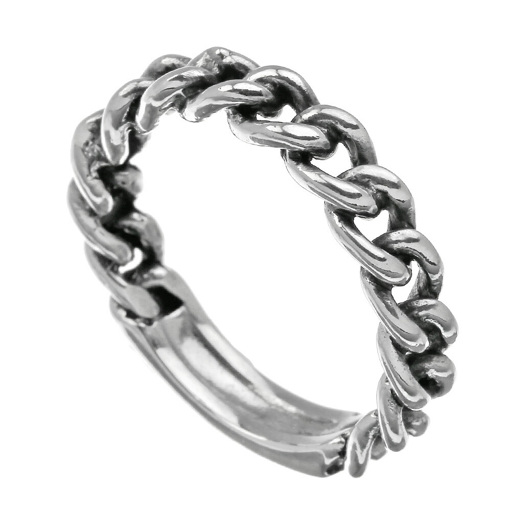 喜平チェーンを模したリングにプレートを繋げた形のリング。プレートを下にするとシンプルなチェーンリングに、プレートを上にするとIDブレスレットデザインのリングに。シーンに合わせて使い分けられる2WAYデザインです。チェーンの隙間に燻しを施しているので、細めでも手元でしっかり主張してくれるリングに仕上がっています。