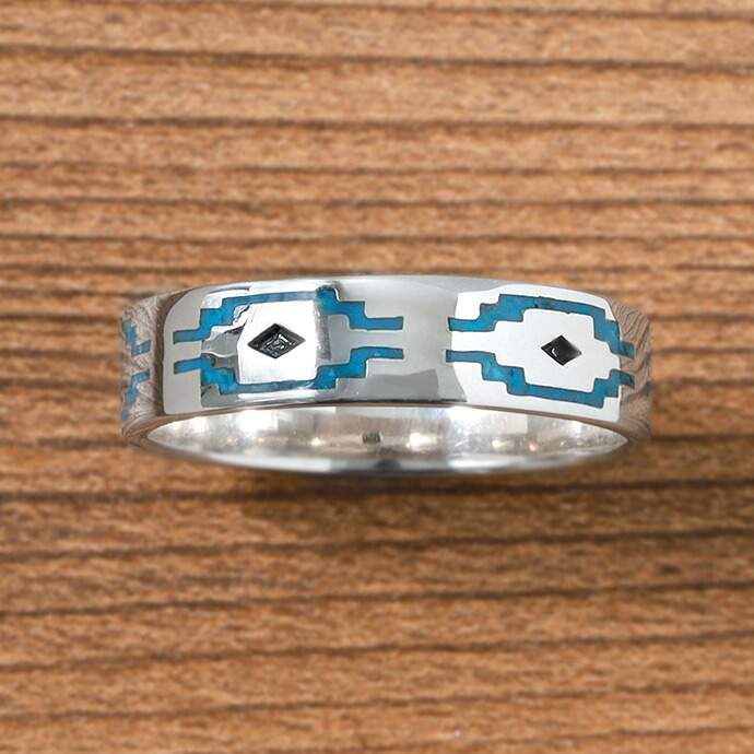 ネイティブ模様がにぎやかなリングは、よく見ると模様にターコイズが埋め込まれています。リングは平打ちなので指馴染みよくデイリーにお使いいただけます。アメカジ好きにはもちろん、ペアリングとしてもオススメです。